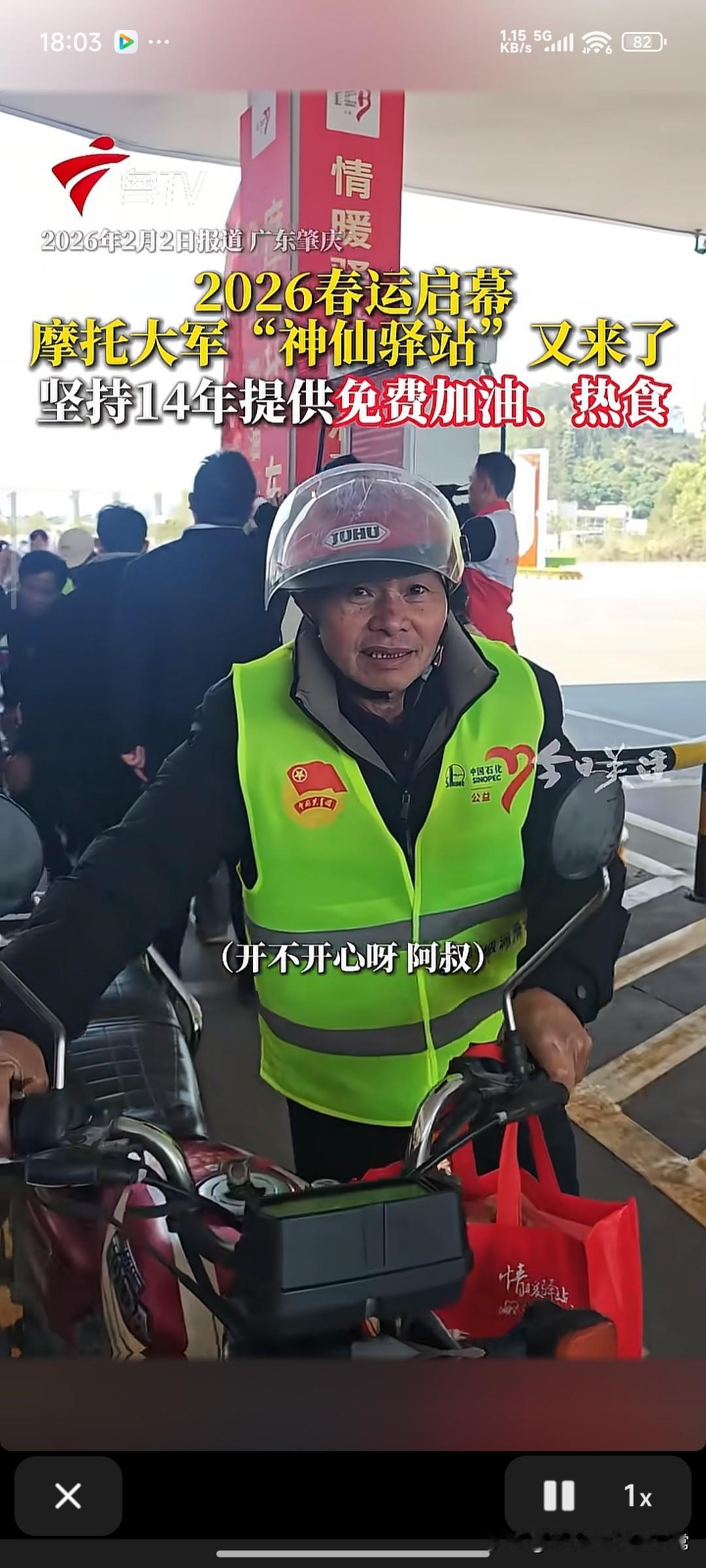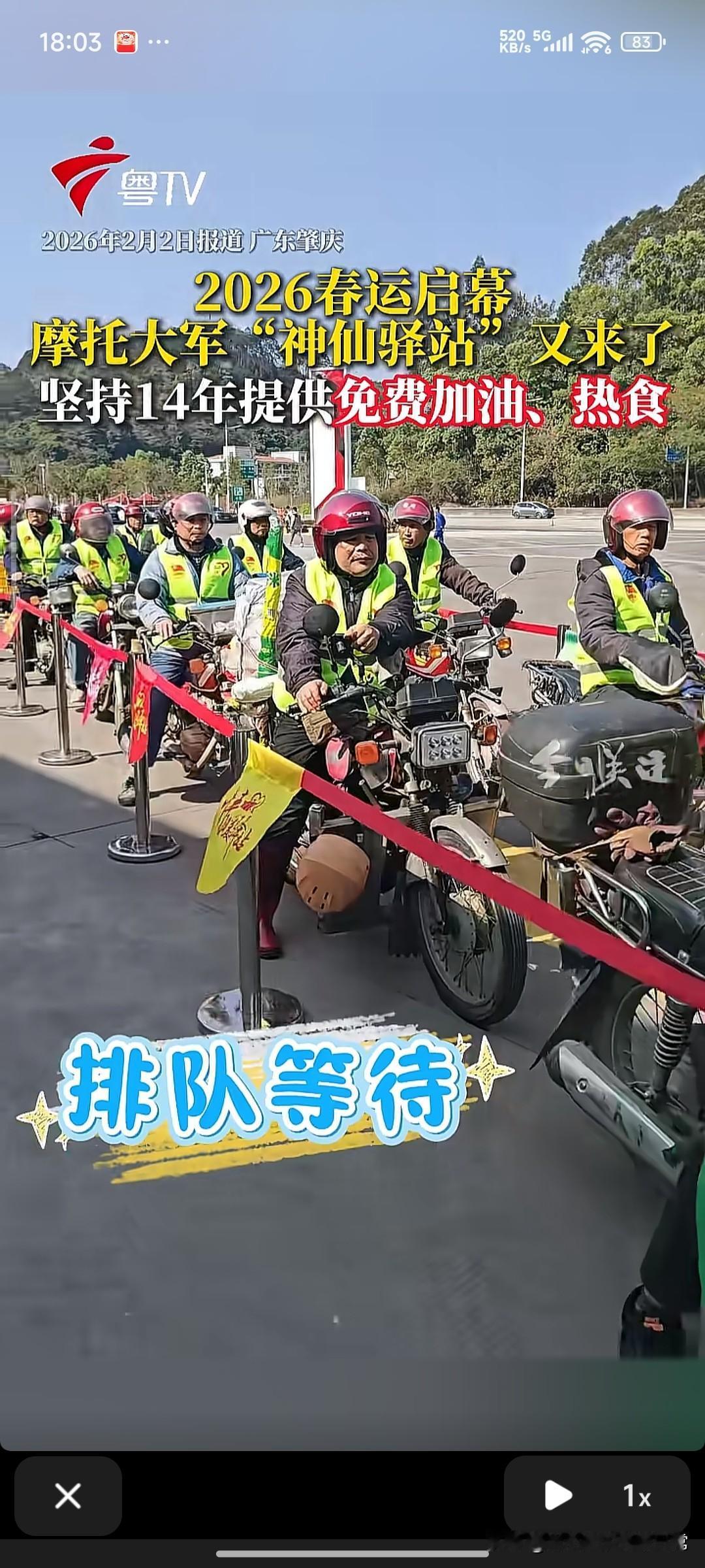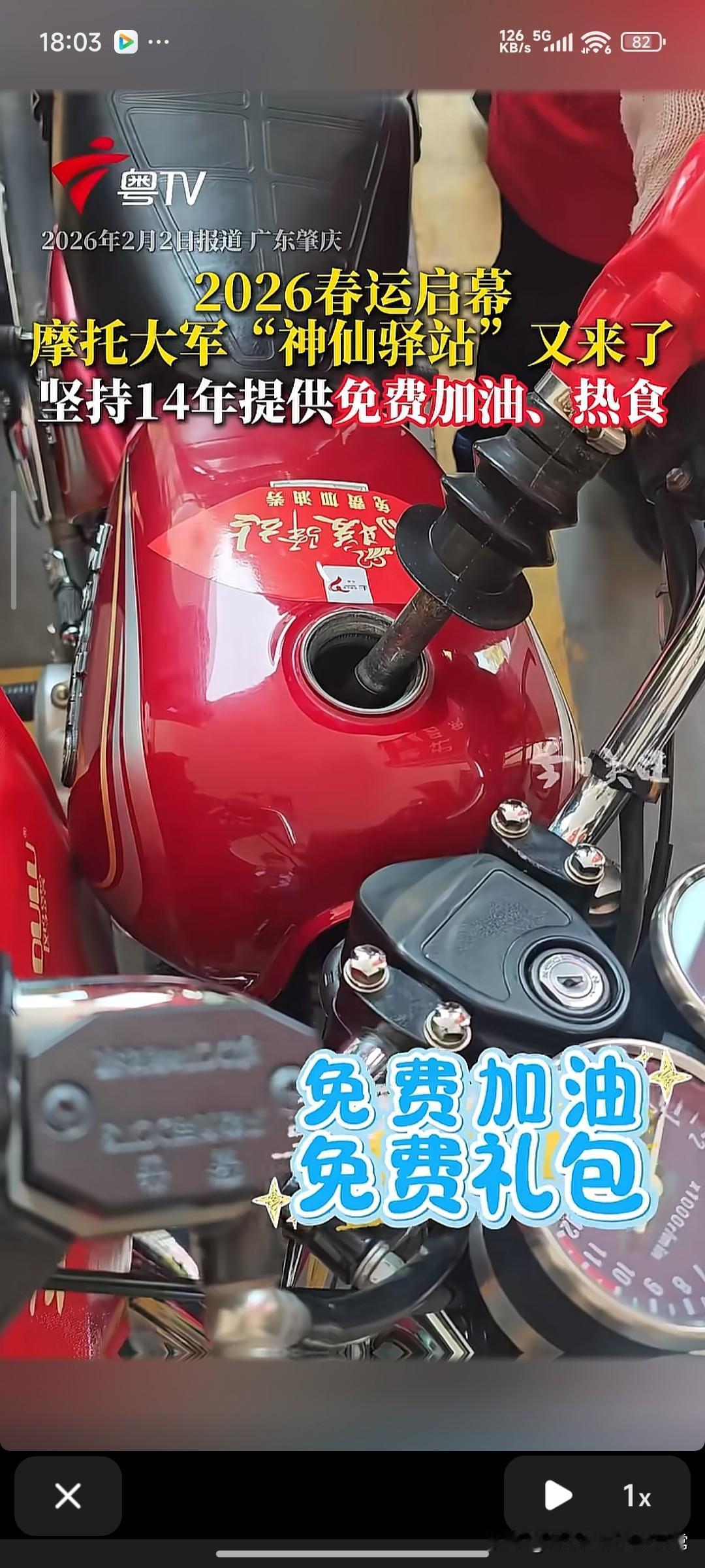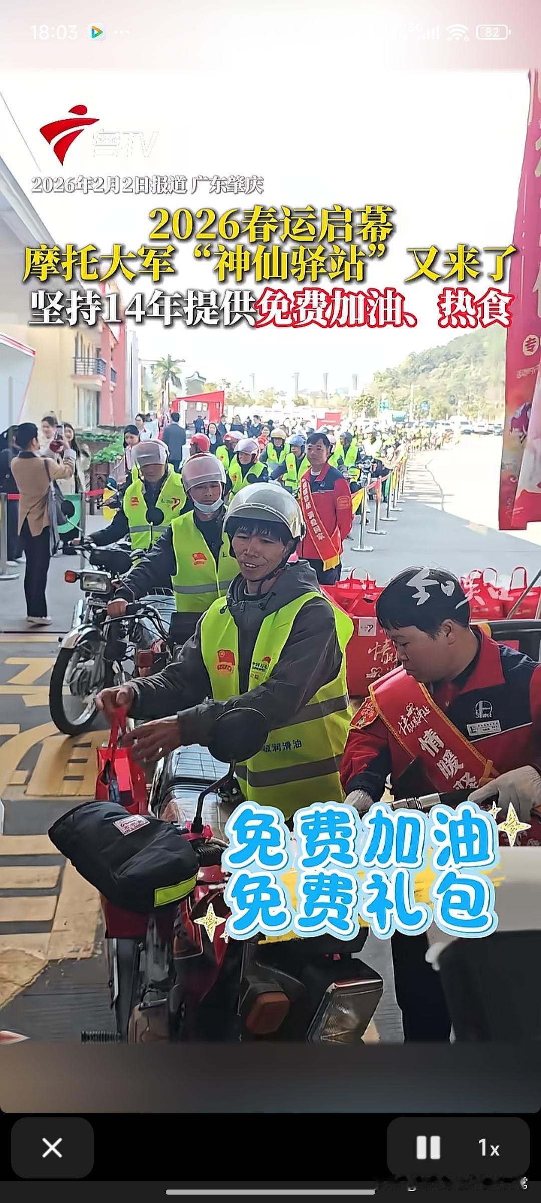广东给农民工免费加油! 2026春运大幕刚拉开,广东肇庆的“摩托大军神仙驿站”又火了🔥!14年风雨无阻,免费加油、热粥姜茶、应急维修全安排上,光油费就帮返乡摩友省了近40块,这波操作直接戳中了打工人的心窝子。 看着排成长龙的摩托队伍,大叔接过免费加油枪时笑得像个孩子,身上的反光背心在阳光下格外亮眼。在外辛苦一整年,就盼着骑上摩托赶回家吃顿团圆饭,没想到半路还能遇上这么暖心的“补给站”。 有人说这是作秀,但14年的坚持早已说明一切。比起冰冷的流量,这份接地气的温暖,才是春运里最动人的底色。这样的“神仙驿站”,你觉得值得全国推广吗?