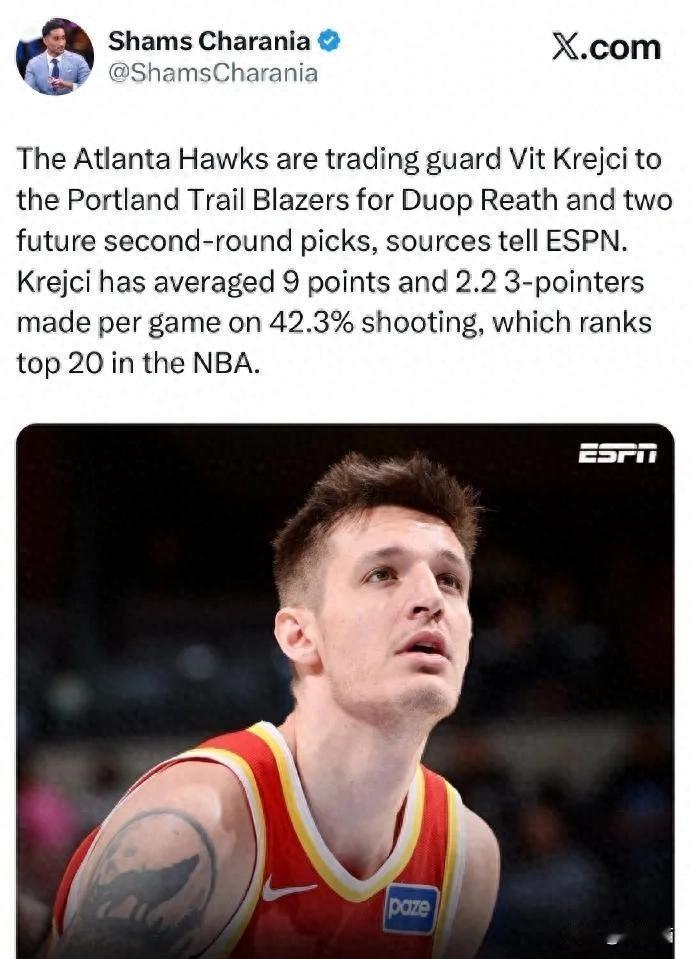 一笔交易,多个年轻人的人生轨迹 NBA的交易市场一直很热闹,开拓者队最近也有动作,不是那种大手笔的引援,感觉是想调整一下阵容吧,为了以后打算,老鹰队和开拓者队做了一笔交易,三换一,老鹰队送走克雷伊奇,换回里斯和两个选秀权,老鹰队应该是想要选秀权吧,里斯可能就是为了配平工资,里斯年薪不高,222万美元,但是他好像受伤了,应力性骨折,赛季报销,他的NBA生涯可能要结束了,挺可惜的,里斯之前还来CBA打过球,在青岛队,他和杨瀚森一起打过球,杨瀚森还年轻,里斯走了,好像是杨瀚森第一次接触NBA的交易规则,应该能感受到市场的残酷,所有人都在想,这到底是怎么一回事。 克雷伊奇去了开拓者队,开拓者队想加强外线,克雷伊奇三分球挺准的,命中率有42.3%,开拓者队现在三分不太行,出手次数不多,命中次数也一般,命中率也不高,战绩也不太好,在西部排在后面,名记Siegel说,这只是开始,开拓者队可能还会卖罗威,开拓者队以后内线可能要培养克林根,还有最近很火的杨瀚森,很多人看完这个故事,都会去想,这对杨瀚森是个机会,也是个挑战。 NBA交易市场其实挺残酷的,就是个生意,但小市场球队也有机会崛起,怎么在激烈的竞争中站稳脚跟,就需要聪明和努力,对年轻球员来说,要好好把握机会,提升自己,只有这样才能生存下去,毕竟谁也不知道,下一秒会发生什么。