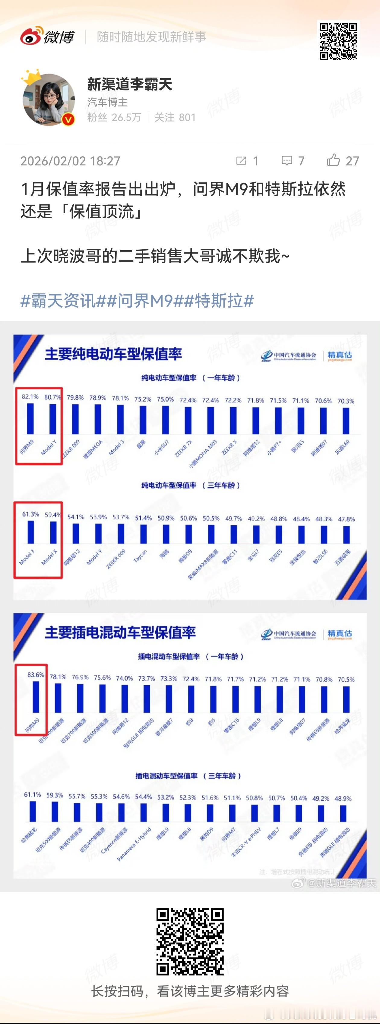 2026年1月,问界M9的一年保值率在纯电车型和插电混动车型中都位列第一!
