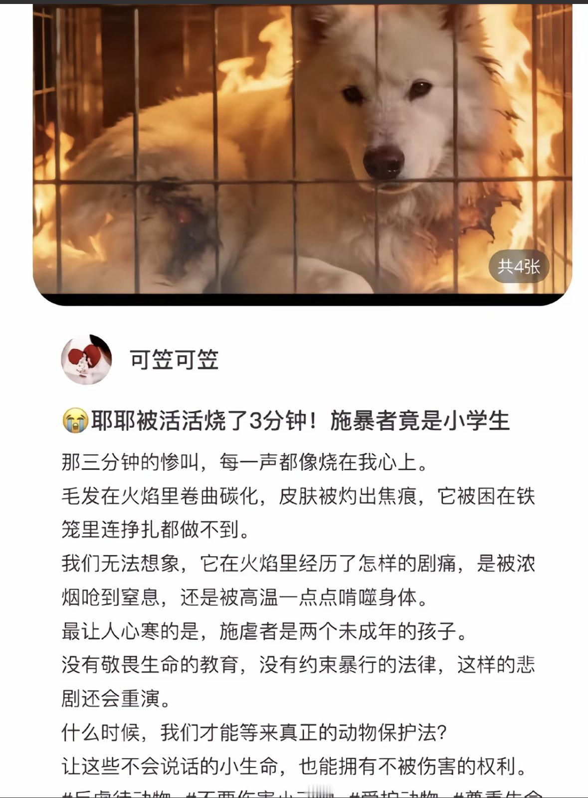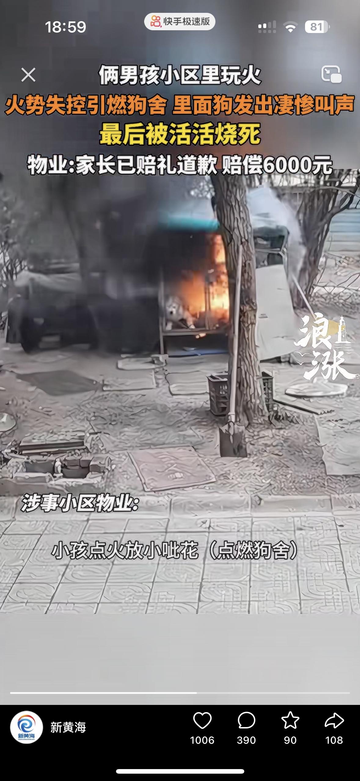 看的太让人气愤了!明明可以救它,却让它被活活烧死 2个男孩在小区里玩火,没想到火势失控直接点燃了狗舍,狗笼子里锁着一条萨摩耶,急得狗不停的叫,两个孩子想施救却没能力,狗狗在叫声中逐渐没了气息,活活的被烧死了 虽然赔了6000元和狗主人和解了,可太让人气愤了,那么大孩子,知道起火了救不了,最起码可以踹门把狗救出来呀!就看着狗被活活的烧死,真是作孽呀,这要是烧到居民楼后果不堪设想,孩子是小,但不能成为免责的挡箭牌,就该狠狠的揍一顿长长教训