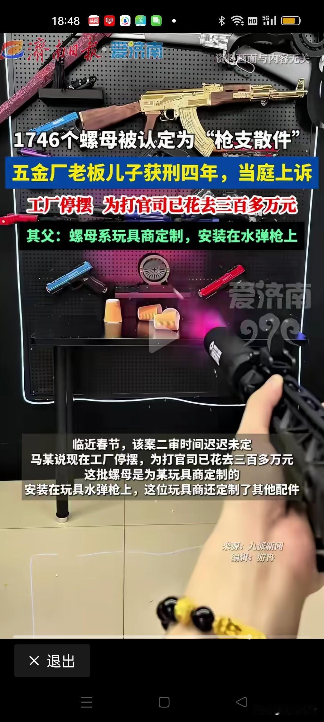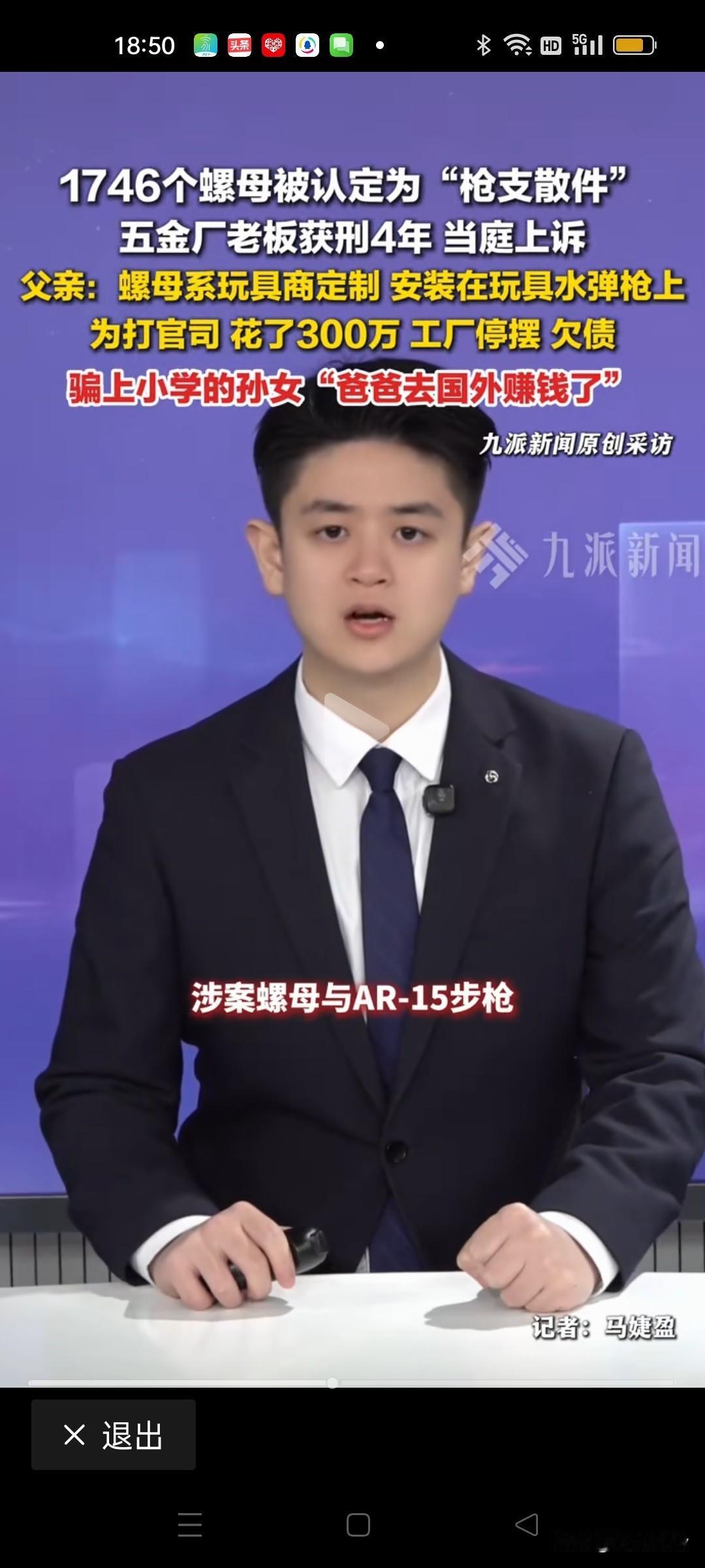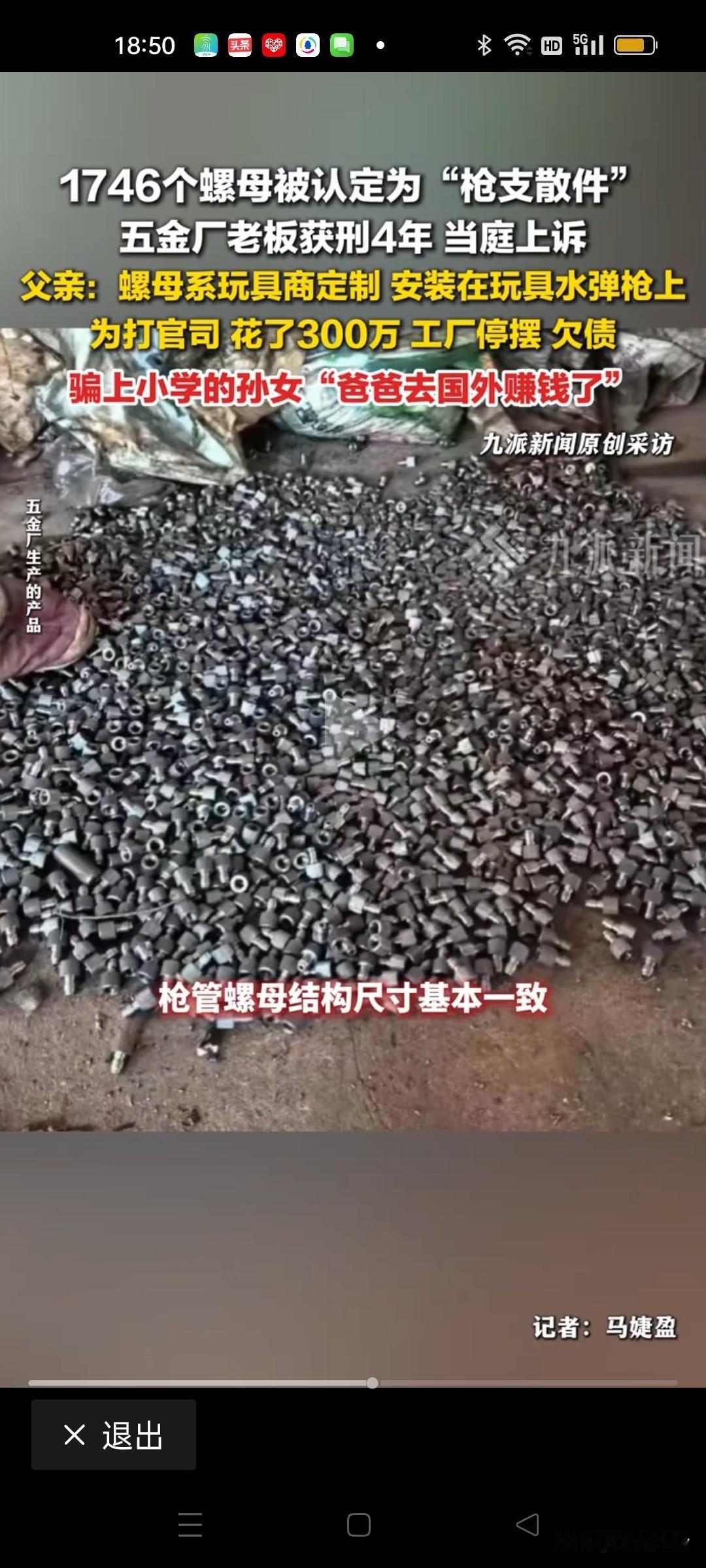 江苏南通五金工厂的1746个螺母被认定为“枪支散件”这件事感觉很扯! 你说人家的螺母散件与AR15配件相似甚至可以互换,可结果在实际操作中根本套不上,只能说相似罢了! 人家是玩具商定制的用于水弹枪使用的,如果说这些螺母配件与AR15配件相似甚至互用,是不是有点牵强? 现在市场上卖的仿真枪多的去了,绝大多数是塑料制品,但也有合金的和钢铁枪管组装的,但仅仅是玩具而已,不能发射子弹,基本都是软弹和水弹,如果具有一定的杀伤力那就另当别论了! 但是仅凭相似就认定为“枪支散件”没有啥说服力,毕竟一把枪的组成部分需要几十种部件,如果这样定性,那些生产无缝钢管、弹簧、甚至瞄准镜的生产厂商会不会都有麻烦? 让五金厂老板获刑四年,厂子倒闭,工人失业,又加上打官司花掉300万,这个代价确实太大了! 问题来了,民用设备配件能不能与军用警用设备相近或者通用?怎么区分?是规格上区分?用途上区分?还是材料上区分?
