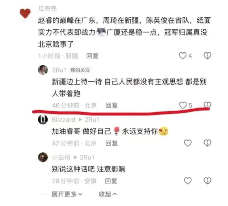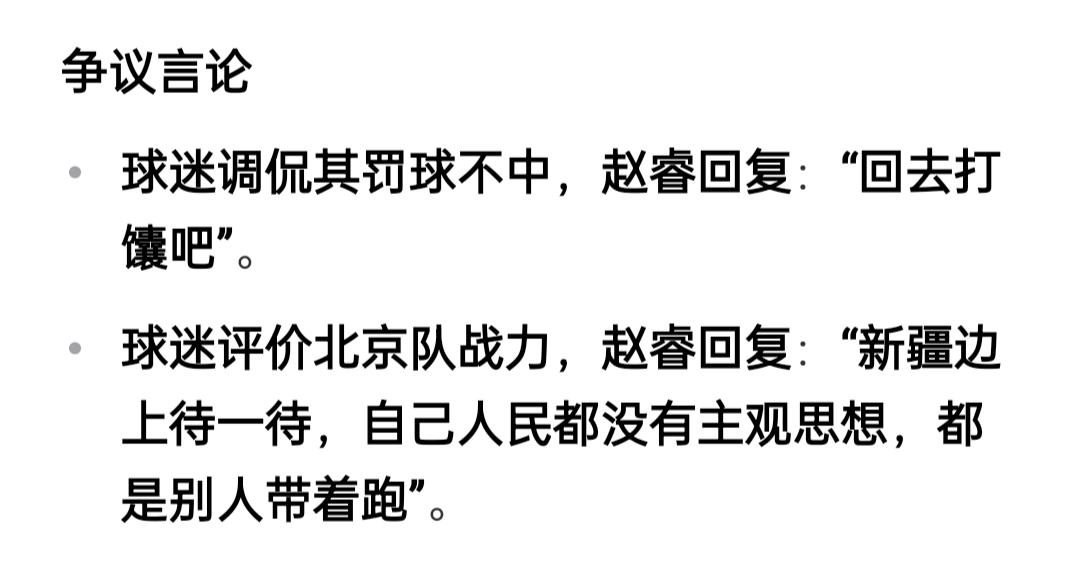 就赵睿来说, 人家没有说错的, 没有人家赵睿,昨晚的比赛, 就没有可能把那个18分的大坑填上, 人家是这场比赛的功臣之一, 他能激活马蒂昂, 至于其余的两句话, 就篮球这个圈来讲, 就是说新疆球迷不懂球, 被别人带了节奏了, 回去好好温习一下比赛就行, 至于别的啥的,他又不懂的, 他就懂个打篮球,还是个半通, 别的大帽子, 球迷们也就别给赵睿扣了!