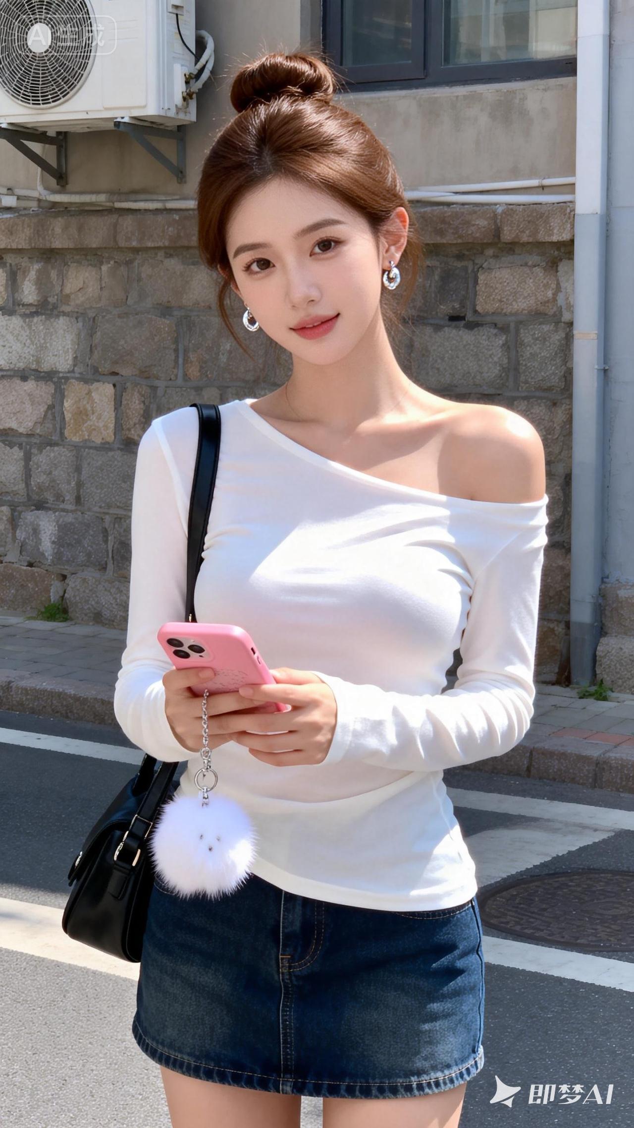 中国年轻女性,棕色盘发,佩戴耳环,穿着白色单侧露肩上衣、深蓝色牛仔短裙,斜挎黑色包