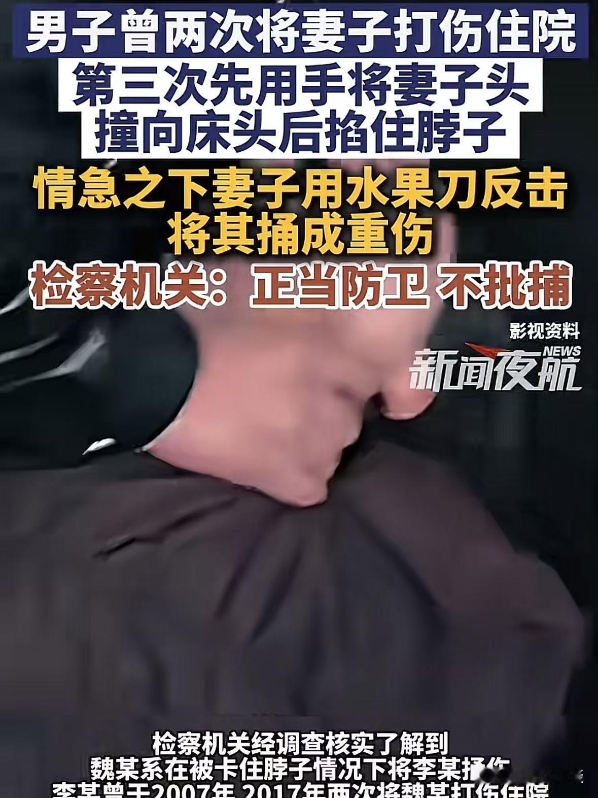 这就是打老婆的下场!湖北,男子长期殴打妻子,曾2次把妻子打伤住院,第3次竟然抓着妻子的头往床头上撞,还用力掐住妻子的脖子,让她无法呼吸,妻子用尽全力反抗,情急之下抄起水果刀反抗,致丈夫重伤2级。事后警方向检察院提请批准逮捕该女子,女子哭诉,称自己是正当防卫,而法院最终判决,迎来了令人意外的结果! 夫妻过日子,磕磕绊绊、吵个嘴拌个舌都是常有的事,谁家还没点鸡毛蒜皮的琐事。 可偏偏李某,脾气暴得不像话,一点小事就能炸毛。 那天不知道是因为柴米油盐的小事没谈拢,还是心里有别的不痛快。 夫妻俩吵着吵着,李某就控制不住自己的火气了,当场就开始打砸家里的家具。 好好的一个家,桌椅板凳可能被掀翻,锅碗瓢盆摔得满地都是。 转天,前一天的的火气还没消,两人又因为之前的事吵了起来。 这一次,李某的暴 力升级,完全没了一点夫妻情分。 他上来就抓住妻子魏某的头部,直接往床头撞过去。 魏某当时被撞的头晕目眩,可李某并没有因此停手,而是紧紧的用手死死掐住了妻子的脖子。 魏某被掐得喘不过气,脸憋得通红,意识都可能开始模糊了。 魏某此时感觉自己马上就要完了,下意识的奋力反抗。 求生本能被激发,情急之下,她胡乱抓到一把水果刀。 她当时没有时间多想,也没有时间去考虑后果,只是想赶紧摆脱李某的控制,于是抓起水果刀朝着李某捅了过去。 这一刀下去,李某受伤了,后来经鉴定是重伤二级,而魏某也终于挣脱了束缚,捡回了一条命。 而案发之后,警方向检察机关提请逮捕魏某。 这一下,魏某懵了,她又委屈又害怕,自己明明是受害者,长期被家B,最后为了自保伤了人,反而要被逮捕? 好在检察院并未仅以伤害结果定论,而是细致核查案件细节,调取现场证据、询问当事人并追溯双方过往关系。 查明魏某长期遭受李某家B,2007年、2017年曾两度被其打伤住院,此次冲突并非偶然。 结合魏某被李某掐脖、生命岌岌可危的紧急情境,他们认为: 魏某的捅刺行为是为自保,具有紧迫性与必要性,未超过正当防卫限度。 《刑法》第20条:为了使公共利益、本人或者他人的人身、财产和其他权利免受正在进行的不法侵害,而采取的制止不法侵害的行为,对不法侵害人造成损害的,属于正当防卫,不负刑事责任。 最终在2025年4月,检察院认为魏女士属于正当防卫,做出不批捕决定! 这事一经报道,网友们纷纷点赞“太解气了,这个结果才叫公正!” 希望这件事也告诉一些同样的受害者,遇到暴力别硬扛,家 B只有0次和无数次,该反抗就反抗,法律会保护真正的受害者! 还有网友表示:顺便也给那些施暴的人敲个警钟,别以为打老婆没人管。 真把人逼急了,反击起来你连后悔的机会都没有!对家B零容忍! 对此,你怎么看这件事! @静心法谈 学法辨是非,慬法不吃亏。