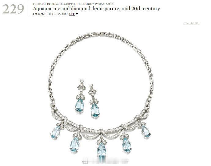 曾属于波旁-帕尔马公主&两西西里王妃艾丽西亚的海蓝宝套装,就是2018年去世后一个人的遗产撑起整场拍卖会,一共卖了5000多万瑞郎那个艾丽西亚。同时通过丈夫的关系,她也是西班牙胡安·卡洛斯国王的亲舅妈 这套来源不明,大概就不是祖上传下来的,艾丽西亚借过给长媳两次,但最后还是卖了,2018年拍了3.5万瑞郎还有童鞋直呼划算。2019年卖第二次估价就2万瑞郎左右,还没卖出去,第一手卖家估计亏麻了 个人猜测可能因为体量不太大?