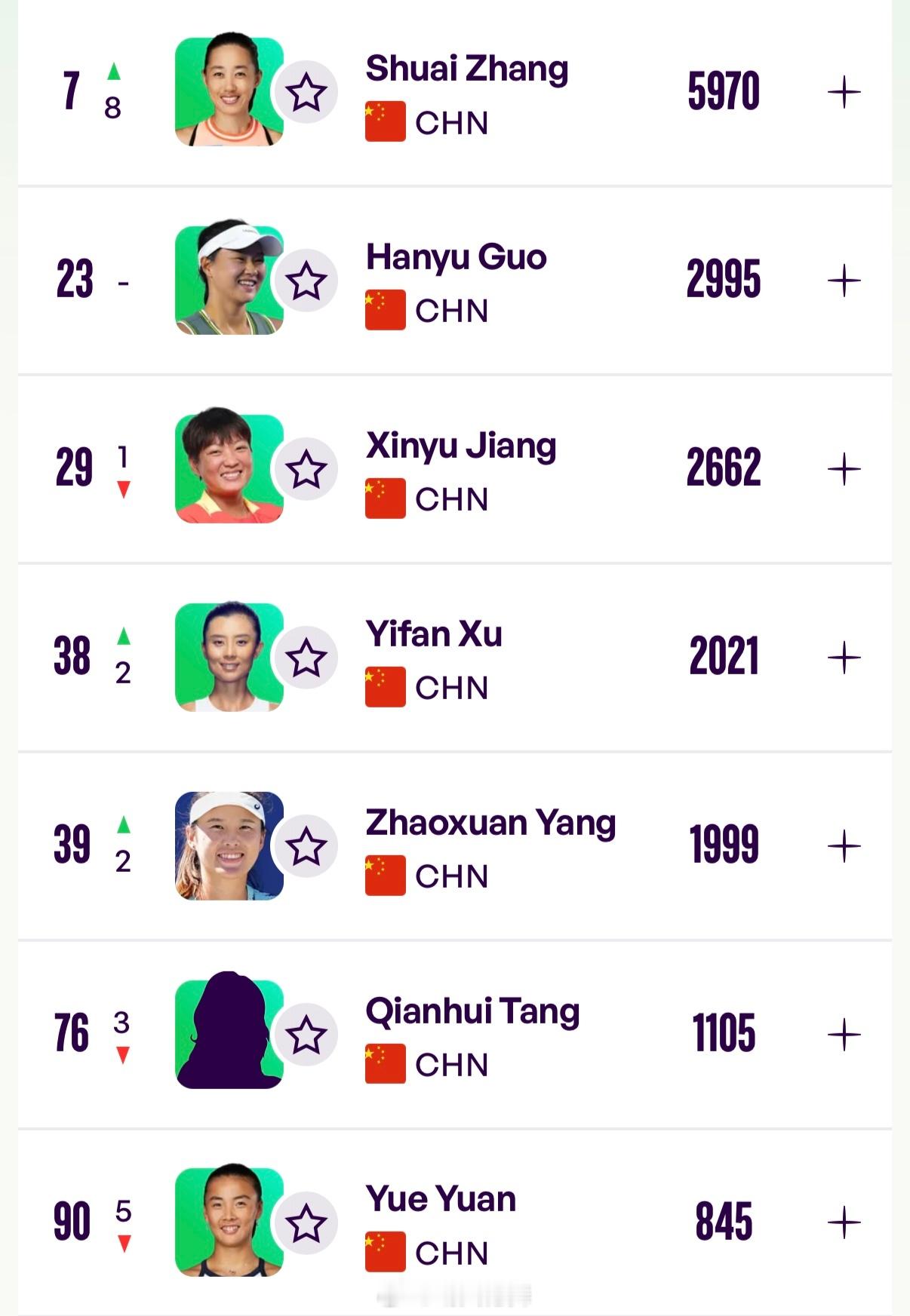 中国球员WTA双打排名更新(Top200)7 张帅🇨🇳(+8)23 郭涵煜🇨🇳29 蒋欣玗🇨🇳(-1)38 徐一璠🇨🇳(+2)39 杨钊煊🇨🇳(+2)76 汤千慧🇨🇳(-3)90 袁悦🇨🇳(-5)106 丰硕🇨🇳(+4)115 郑赛赛🇨🇳(-37)138 王欣瑜🇨🇳(-50)141 郑妩双🇨🇳(-4)162 王雅繁🇨🇳(-6)