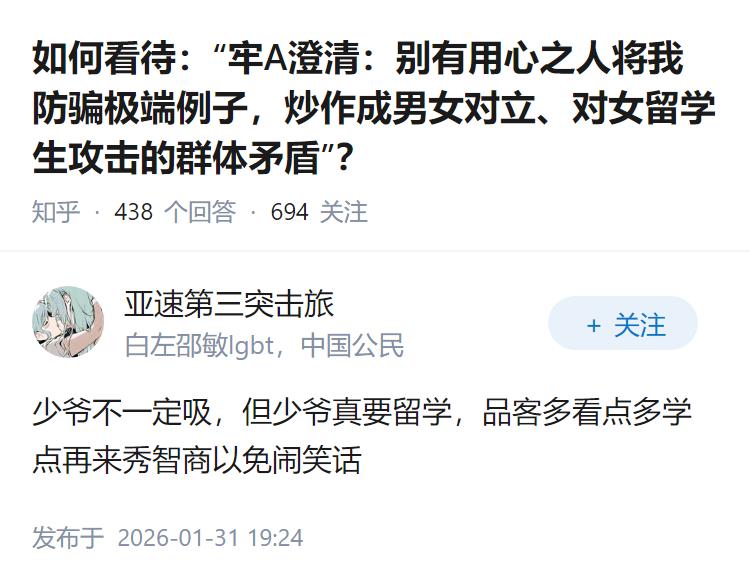如何看待:“牢A澄清:别有用心之人将我防骗极端例子,炒作成男女对立、对女留学生攻击的群体矛盾”?