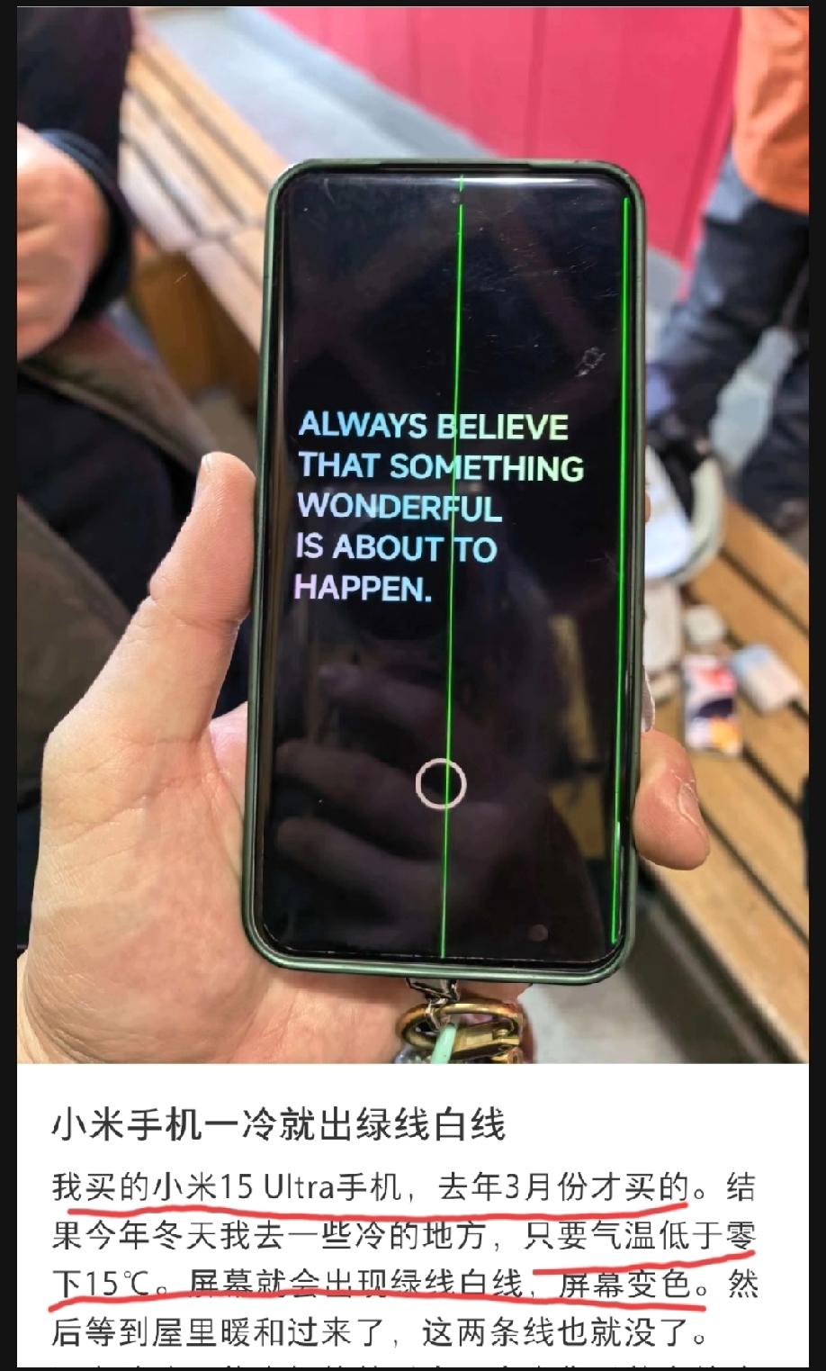 网友发文吐槽:自己去年3月买的小米15ultra手机,出现这么一个现象,只要去一些非常冷的地方,屏幕就会出现绿线白线。问小米售后,工作人员称:这是软件问题,不是硬件问题,要等系统升级。 这位网友提出质疑:这好像明明是硬件问题,小米售后这种操作不会是想把问题拖到过保后才去解决啊?到那时候,再说是硬件问题。 有人调侃这位小米用户:谁会没事经常跑零下15°的地方去。再说了,就中间一条绿线,又不影响手机的正常使用,克服一下吧?雷总带领小米公司面对国内外同行的围追堵截已经非常不容易了,这点小事还要闹到网上,给雷总添堵,你还是不是米粉啦? [捂脸][捂脸][捂脸]