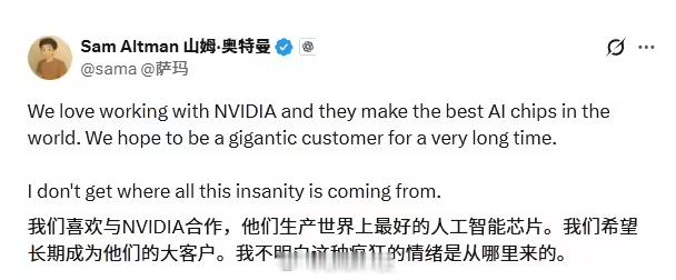 OpenAI回应与英伟达不合传言【OpenAICEO称英伟达芯片最棒,希望长期成为其大客户】OpenAI 首席执行官萨姆・奥尔特曼(Sam Altman)今日在 X 平台(前身为推特)发文称:“我们喜欢与英伟达合作,他们生产世界上最好的人工智能芯片。我们希望长期成为他们的大客户。我实在搞不懂这些毫无根据的疯狂传言是从哪里来的。”