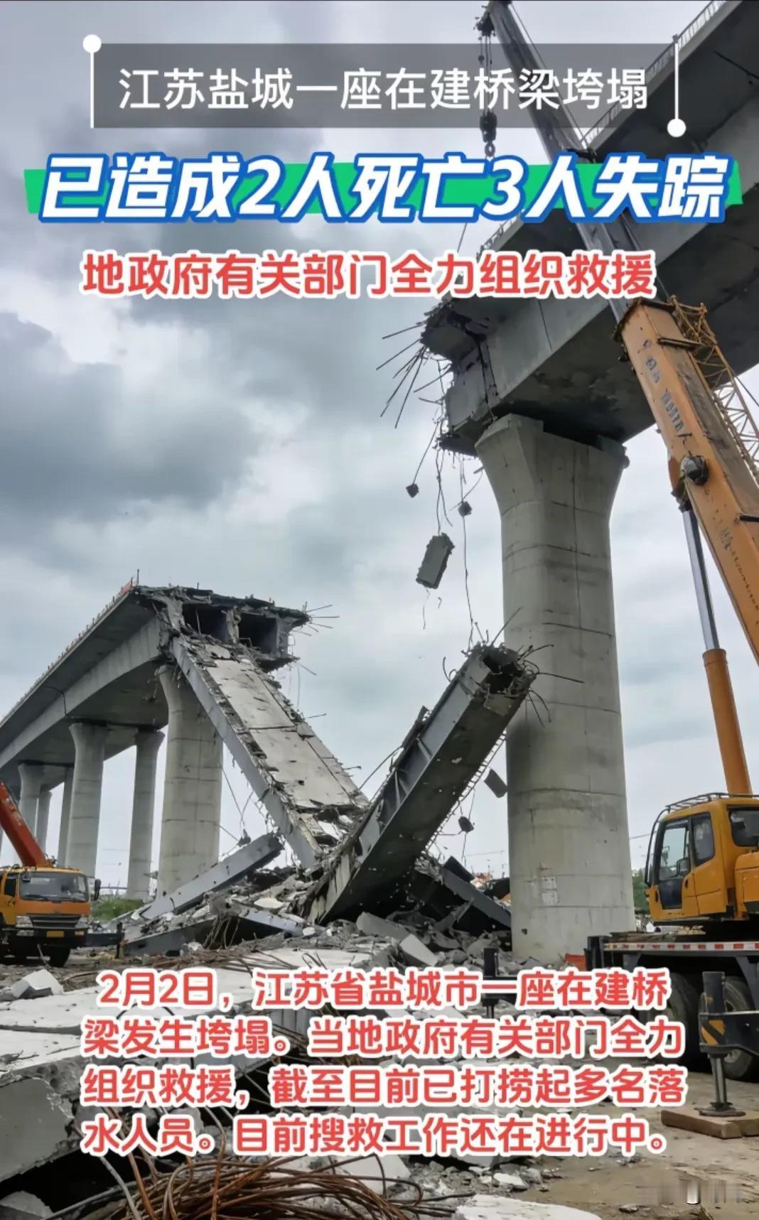 一在建大桥垮塌致2死3失联,当地计划2026年9月通车。事发2月2日17点46分左右,在江苏省盐城市响水县,一座老桥被拆除,而新桥在建设中突然垮塌,致多名工人伤亡。 据了解,该项目由中铁十二局承建,原月港大桥修建于1995年,质量没有问题。因桥太矮不满足河道通航要求,需要拆除重建。2025年3月底开始拆除原桥修建新桥,在2026年2月2日的施工过程中,突然发生系杆拱梁塌落事故。 事故发生后,消防和应急等部门快速赶来救援,但是造成重伤的2人救治无效不幸身亡,还有3人目前失联。该工程设计单位为华设设计集团股份有限公司,目前事故原因还在调查中,善后处理也在进行中。 江苏盐城一在建大桥发生垮塌 盐城响水县月港大桥突然垮塌2死2失踪