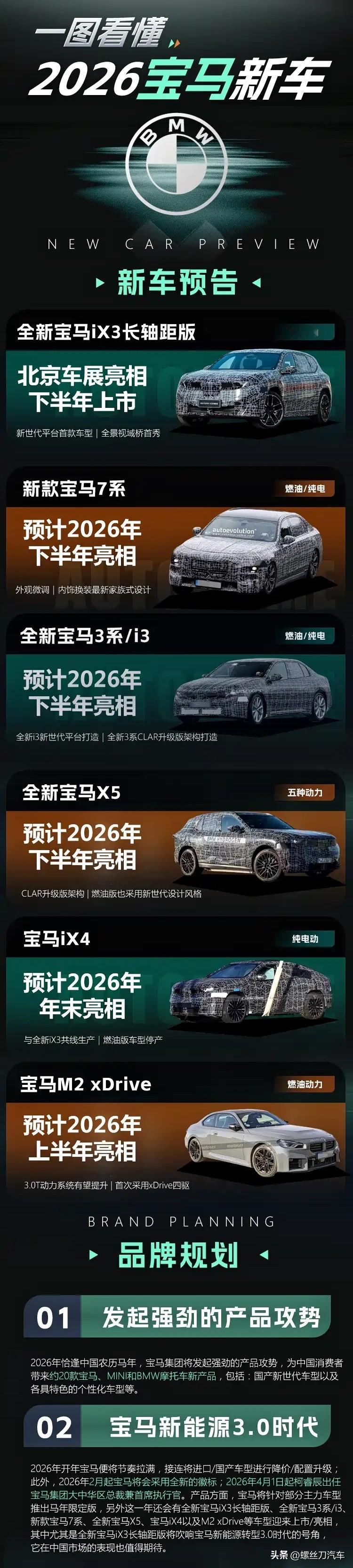 “王炸”产品即将到来!一图看懂2026年宝马新车 宝马集团在2025年全球市场交付2463715辆新车(含宝马、MINI和劳斯莱斯),其中中国市场销售新车625527辆,同比下滑12.5%。虽然从数据上看,宝马在中国市场似乎正在失势,但中国依然是宝马集团全球第一大市场。 与此同时,宝马蓄谋已久的反击战也即将在2026年正式打响。“王炸”产品即将到来,全新宝马iX3长轴距版、新款宝马7系、全新宝马3系/i3、全新宝马X5、宝马iX4、宝马M2 xDrive都将到来。 宝马的新能源转型其实非常早,早在2014年便推出了宝马i3和i8,不过由于当时理念过于超前且价格不菲,导致它们一直都面临叫好不叫座的情况,这也是宝马新能源转型的1.0时期。宝马新能源转型2.0时期则依靠CLAR架构的扩展性和兼容性来打造电动车,这虽然让它们更加亲民,且保留了宝马燃油车的驾驶特性,但是在国内产品不断高端化以及智能化发展的冲击下,宝马的纯电动产品逐渐失去竞争力,甚至坊间会以“杂牌电动车”对其进行调侃。 2026年,宝马不仅将完成对CLAR架构的升级,使其能够兼容五种动力总成,同时全新的新世代平台也即将亮剑。值得一提的是,2026年只是宝马新能源3.0时期序幕,在2027年还会带来全新1系/i1、全新X1/iX1、宝马X7/iX7、新款宝马5系/i5、3系插混版以及M3纯电动版等多款新车,那么在宝马新能源3.0时期能否打出漂亮的翻身仗,或许就看全新宝马iX3长轴距版在中国市场能否成功了?大家期待吗?
