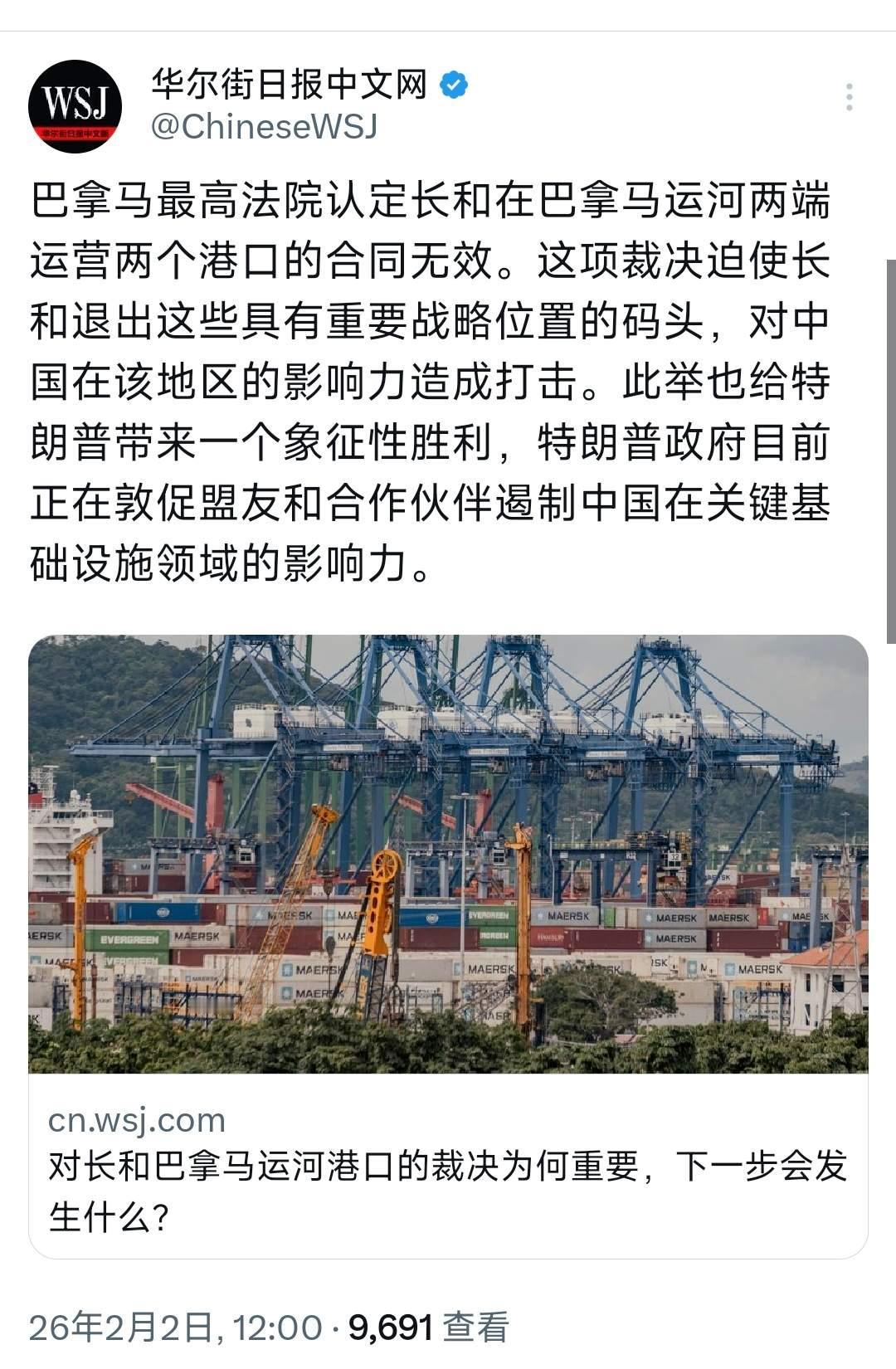 巴拿马🇵🇦最高法院裁定——长和经营巴拿马运河附近两个港口的合约违宪,完全是意料中事[思考]国家层面博弈,“大炮射程之内”可以“讲道理”,“射程之外”就只能听别人“讲道理”了,川普的主要战略是“全球收缩”、巩固美洲,这个“子”非落不可,巴拿马敢不配合?[吃瓜群众]不过,从《华尔街日报》的腔调来看,显然和华盛顿不是“一条心”啊[奸笑]