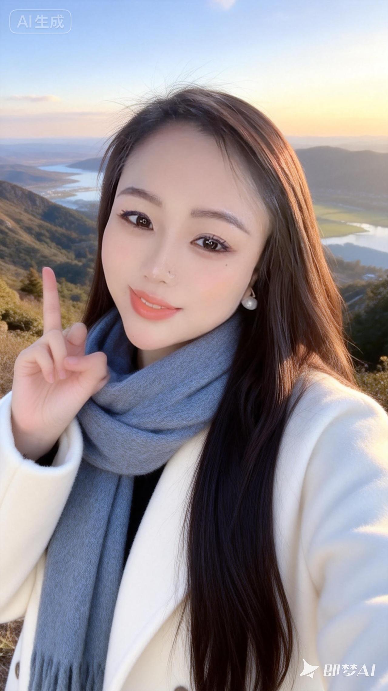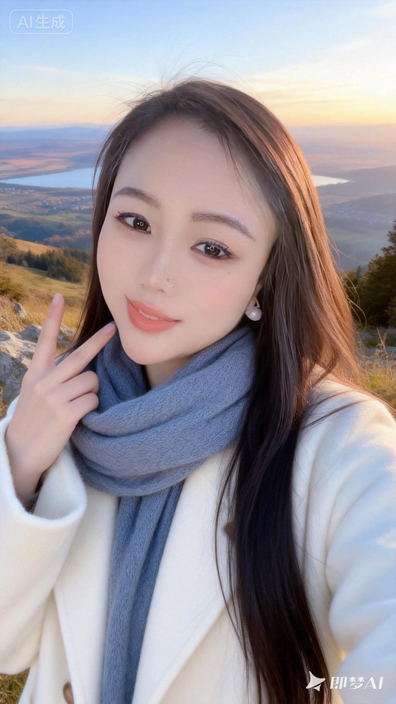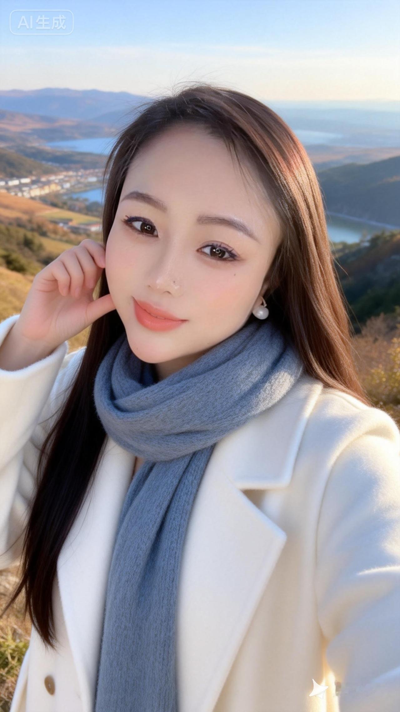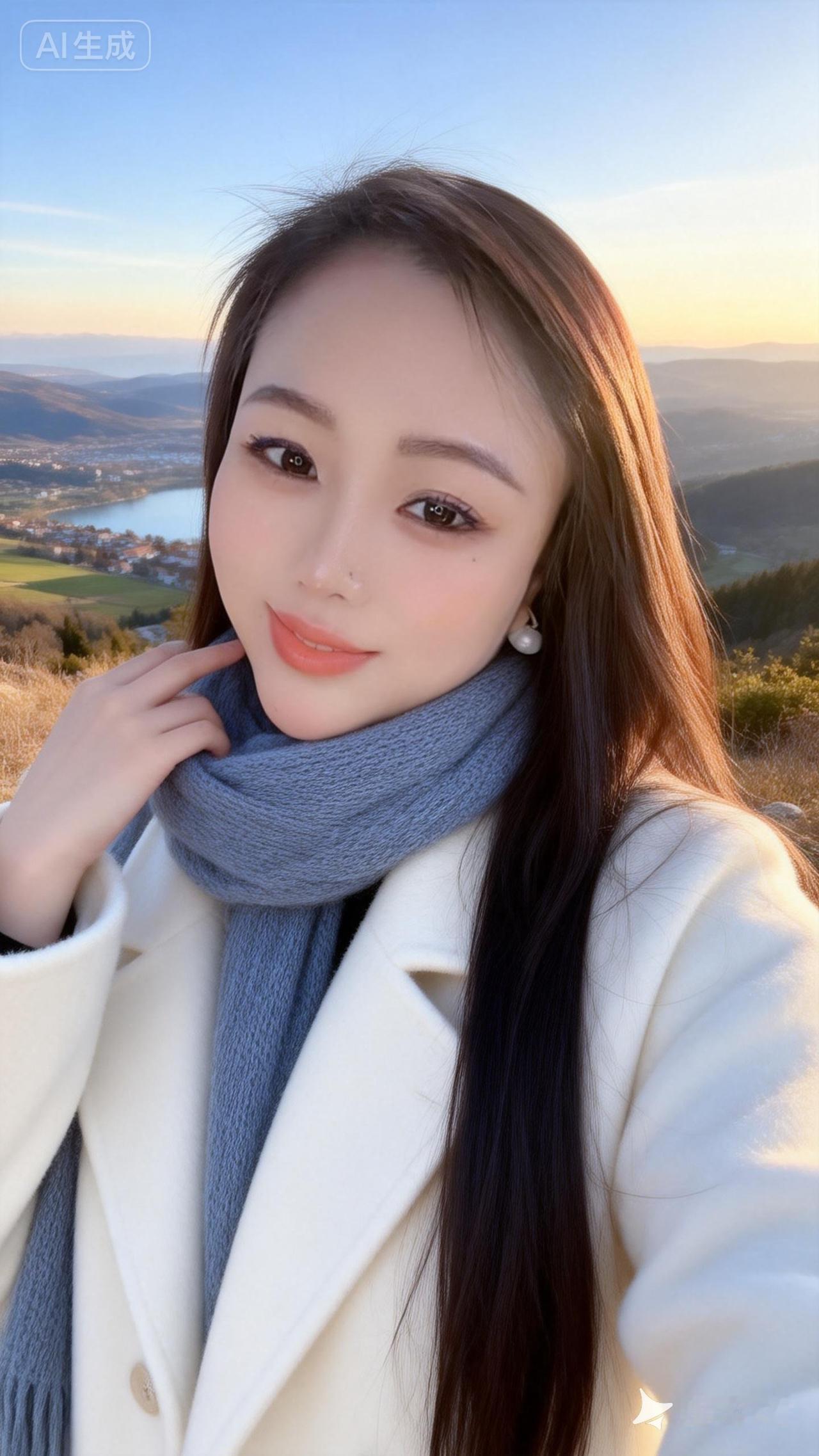 暖调,光影艺术,清透,超长发御姐,皮肤白皙,淡豆沙杏色唇色,她身穿身穿白色昵大衣,灰蓝色围巾