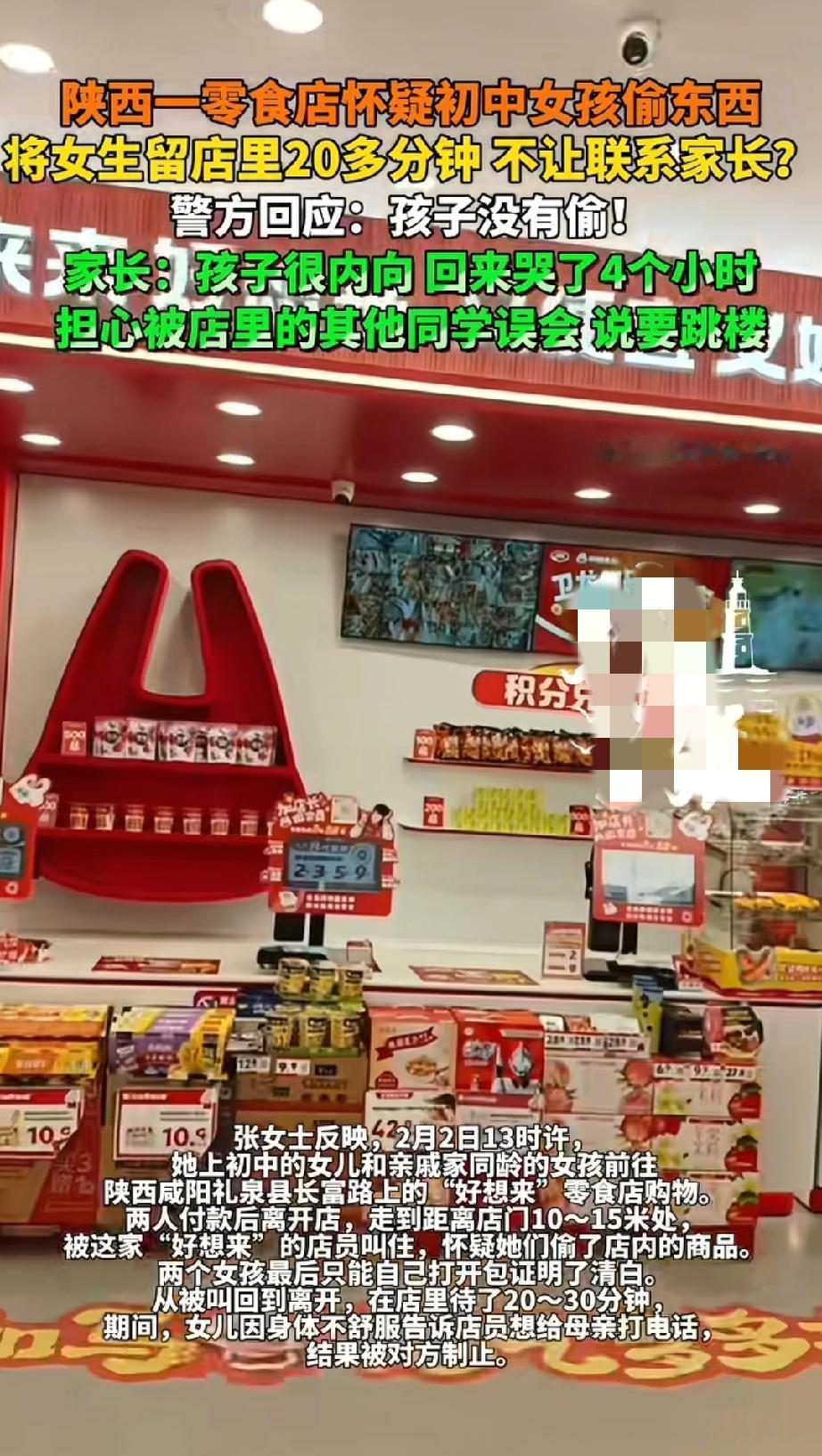 这店是要逼死孩子吗?!陕西咸阳这家“好想来”零食店,真的太让人火大了! 两个初中小姑娘,付完钱刚走出店门,就被店员叫回去,硬说她们偷了东西。 把人扣在店里整整20多分钟,连孩子想给妈妈打个电话都不让! 最后还是孩子自己把包打开,才证明了清白。 这俩孩子本来就内向,回家直接哭了4个小时,哭着跟妈妈说:“别人会怎么看我,我要不要跳楼算了。” 你听听,这是一个初中生说出来的话吗?! 店员就凭自己的怀疑,就能随便把孩子扣下,还不让联系家长? 现在警方都已经证实孩子没偷东西了,这店的人就没有一点愧疚吗? 马上就过年了,谁家孩子不是宝贝? 就因为你们的偏见和无知,差点毁了两个孩子! 这种店,必须给个说法! 好想来零食