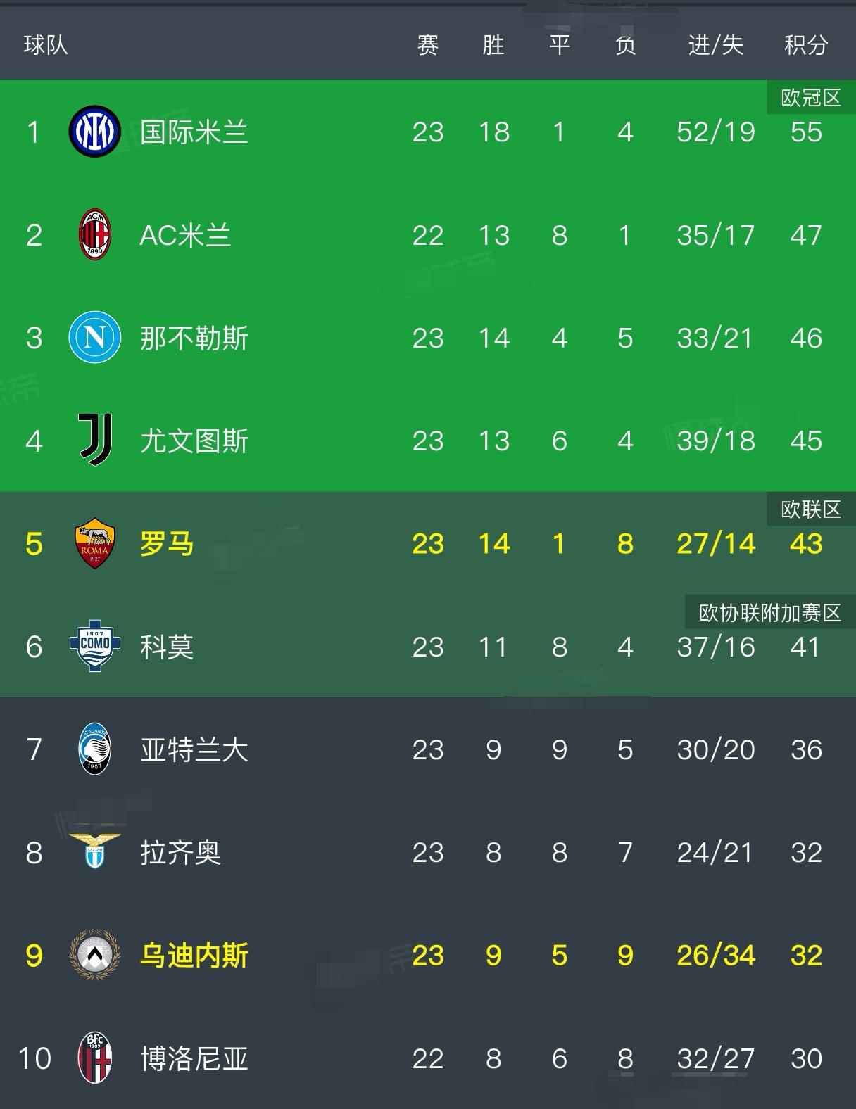 随着罗马客场0-1不敌乌迪内斯,意甲最新积分榜出炉,国米继续领跑,领先少赛一场的
