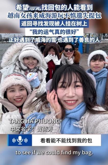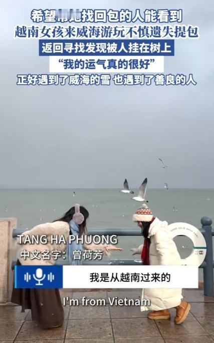 山东,一名在中国留学的越南姑娘,趁放假来威海看雪,结果因为玩得太高兴,不小心将挎包遗落而不自知,等她打车去车站时才发现挎包不见了!她赶紧折返去找,却发现自己的挎包正挂在路边一棵小树的树杈上,特别显眼,之后,这名越南姑娘还专门发视频感谢捡到她包的那个人,还说因为这件事彻底喜欢上了这座城市。 威海,每年 11 月到次年 2 月都是威海的降雪期,沿海片区的降雪量在山东地级市里常年排在前列,火炬八街、国际海水浴场这些地方,一到下雪天就成了打卡顶流,每年冬天来这赏雪的游客比平日里能翻三倍还多。 一位来自越南的姑娘就是专门来威海体验雪景的,她与自己的小姐妹们计划来威海旅行三天,这三天里,她们体验了各种他们没吃过的中国美食,以及好玩的娱乐项目。 跟朋友们在雪地里打打雪仗,买点鸟食喂喂海边的海鸥,在雪景前美美的拍摄画片,这三天的旅行时光别提多快乐了,在旅行即将结束的时候,这个越南姑娘跟自己的朋友提议,一起去当地特色的餐馆吃最后一顿饭。 这一提议被全票通过,于是在拍完最后一张雪景之后,几人就坐地铁准备去吃饭,没曾想这个越南姑娘的包被她落在了雪景拍摄地,等她到了饭店,跟朋友们开始吃饭了,都没察觉到自己忘了什么东西。 愉快的用餐时间结束,越南姑娘才后知后觉的发现自己的包好像不见了,这包里有很重要的证件,可万万不能丢啊,姑娘心急如焚,当即原路返回,看看自己的包究竟是忘在哪里了。 等她们千辛万苦终于回到雪景拍摄地时,发现越南姑娘的包不知道被谁挂在了树上,静待她的到来,这让越南姑娘有些惊讶。 在惊讶之余心里就只有温暖,她实在是没想到居然会有好心人用这种方式让她能够更加准确的看到自己丢失的物品。 这让她对威海这座城市的好感又多了一些,随后她拍下挂着她包的小树的照片,剪了一段视频发布在社交平台上。 视频里,她举着自己的包,用真诚又温柔的中文说着,希望那位捡到她包的好心人能看到这条视频,真心感谢这位素未谋面的威海朋友,是这份善意,让她的威海之行变得更加圆满。 她说自己本来只是因为向往威海的雪而来,却没想到,在这片雪地里,遇到了最珍贵的善良,这座城市的美,不仅在山海相依的雪景里,更在威海人的骨子里。 视频的最后,她笑着说,因为这件事,自己彻底喜欢上了威海这座城市,以后一定会常来,再来看看威海的雪,再来感受这座城市的温柔。 这条充满温暖的视频,也让不少网友感受到了威海的善意,有人评论说,这就是威海,雪美,人更美。 也有人说,在威海,捡到东西挂在树上、放在显眼处,是最常见的小事,因为大家都想着,失主肯定会回来找。 威海的美,从来都不只是山海相依的风景,更在威海人刻在骨子里的善良和实在,这份美好,会让这位远道而来的姑娘,永远记住这座冬天有雪、心里有暖的海边小城。 对于这件事,您有什么想说的吗?欢迎评论区留言讨论。 信源:大众网-威海2026-01-24——《越南女孩来威海游玩不慎遗失提包,返回寻找发现被人挂在树上。“我的运气真的很好,”……》