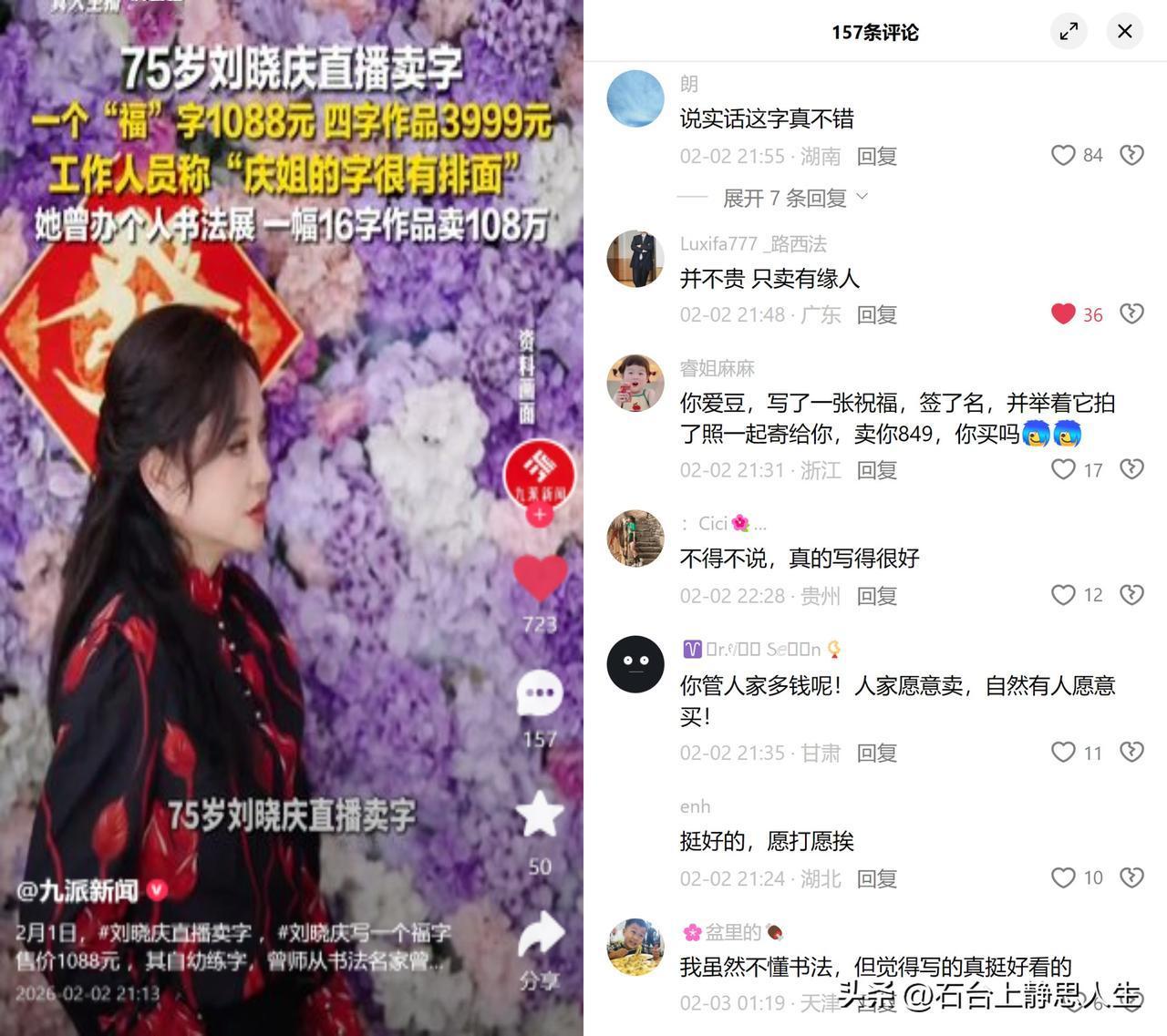 75岁刘晓庆直播卖字 一个福字1088元,四字作品3999元。她自幼练字,师从书法名家曾来德,早年还有16字作品拍出108万的记录,而且那次拍卖并非慈善性质,纯是商业市场驱动的结果。 有意思的是,这次直播卖字的舆论意外宽容。没有漫天的质疑,反而不少人直言字好看,认可愿打愿挨的交易逻辑。有人把这当审美消费,有人视之为高性价比的明星周边,各有各的理由。 这事儿正好契合了当下的一种消费心态:比起模糊的艺术价值,大家更吃明明白白的一套。用过往的商业成交价锚定价值,再用直播间的定价给出选择空间,这种玩法没藏着掖着,反而让消费者觉得踏实。 毕竟,成年人的消费里,我乐意本身就是足够的理由。