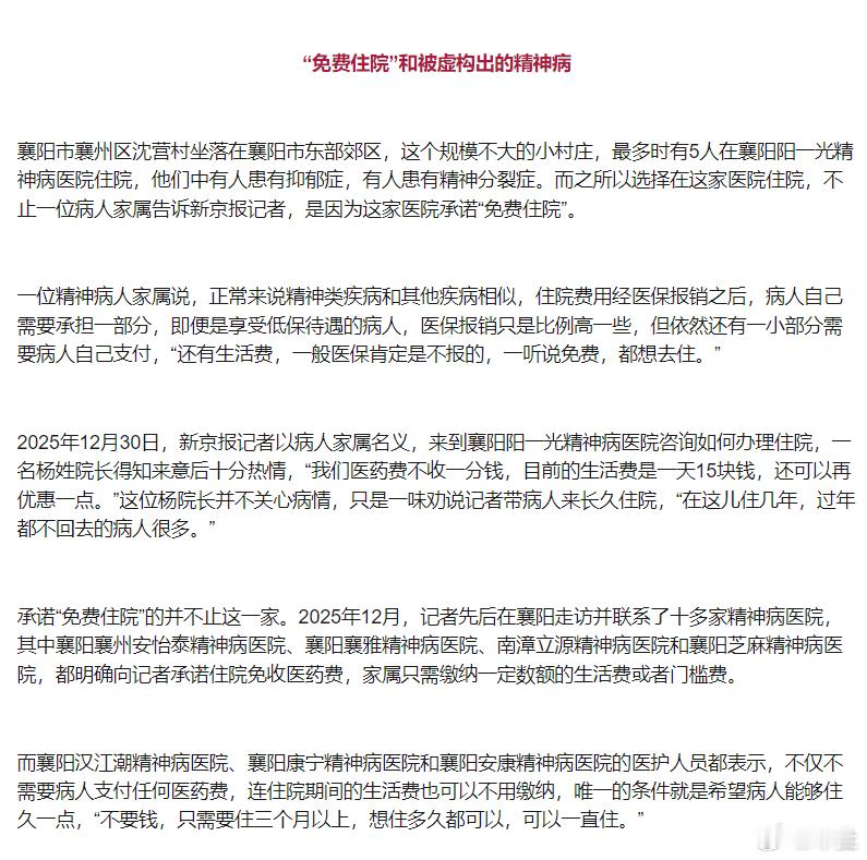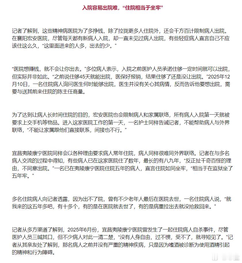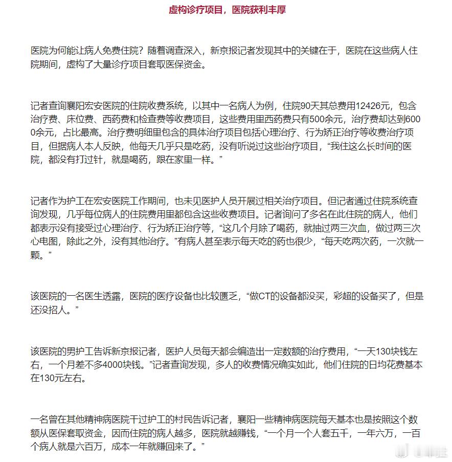 记者卧底精神病医院许多病人无异常 显然精神病医院这是想用纳税人的钱来养自己一辈子啊。如今中国医疗资源这么紧张,这帮人却以此为自己谋利。更可恨的是他们把“病人”当作自己赚取利益的工具,治病救人的地方成了坑人害人的地方。无论从任何一个角度来说,精神病医院相关的人员都需要被严惩,甚至要严查整个相关的产业链。精神病医院骗保调查