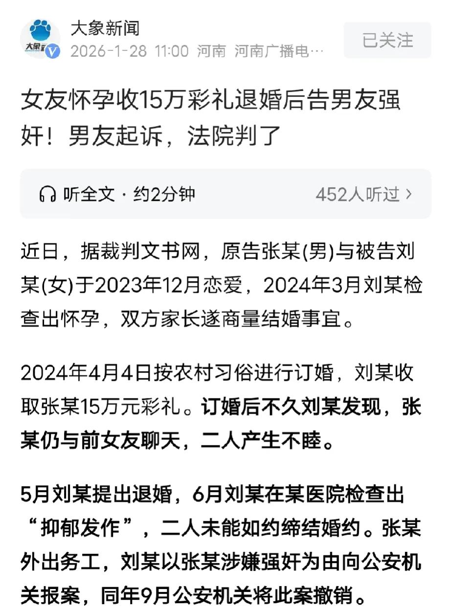 云南昆明,女子怀孕后,男友跟她订婚并支付15万彩礼,谁料,不久后女子发现男友跟他前女友聊天,气愤之下提出退婚并报警称男友强奸了她,女子生下女儿后,两人彻底闹掰,男友告上法庭,要求女子退还15万彩礼,最终判了。 2023年刘某和张某经朋友介绍认识,随着聊天的深入,两人渐渐产生感情。 2023年12月份,张某和刘某正式确认男女朋友关系,两人开始了同居生活。 不久后刘某发现自己的例假迟迟不来,虽然有预感可能是有了,但为了进一步确认,2824年3月初张某陪同刘某到医院检查,刘某查出怀有身孕。 这个小生命的到来,让刘某和张某更坚定了在一起的决心。 2024年4月4日,刘某和张某在长辈们的祝福下,按照当地习俗举办了订婚仪式,张某为了表达对刘某的爱给了她15万彩礼。 本以为,两人从此甜蜜幸福,最终走进婚姻的殿堂相伴到老。 谁料,订婚后不久,刘某发现张某常常背着自己偷偷聊电话,后来经过追问才知道张某的聊天对象是他前女友。 刘某觉得张某跟他前女友藕断丝连,忘不掉前女友,两人为此大吵一架。 5月份,越想越气的刘某跟张某提出了退婚,从那时起刘某终日郁郁寡欢,做什么都提不起兴趣,还时不时就默默流泪。 6月份的时候,在家人的陪伴下,刘某去医院检查,查出“抑郁发作”。 因为刘某这个病,让原本已经定好的婚期未能举行,张某心灰意冷,离开了刘某到外地打工。 刘某看着渐渐大起来的肚子,想着张某对自己的伤害,和他绝情地离去。 刘某气愤之下,打电话报警称,张某强 奸了她,请求公安机关对张某涉嫌强奸罪立案侦查。 之后,公安机关经侦查认定张某没有犯罪事实,按法定程序撤销案件,刑事追诉终止。 2024年12月份,刘某生下女儿,住院期间花费2.6万元,张某主动支付了1.25万。 本以为,有了孩子后,两人之间的关系能有所缓和甚至还有修复的可能。 没想到,张某不但不支付养后续女儿的任何费用,甚至怀疑女儿并非他亲生的,提出做亲子鉴定。 张某一次又一次的伤害让刘某痛心不已,但她还是带着女儿跟张某做了鉴定,鉴定结果证实张某确实是女儿生物学上的父亲。 到这里两人的感情彻底破裂,没了再结婚的可能。 张某觉得自己给了刘某15万彩礼,最终却没结成婚,把刘某告上法庭,要求她返还15万彩礼。 法庭上,刘某辩称他们之所以没有结成婚是因为张某跟他前女友藕断丝连,因为这事自己还患上了抑 郁 症,而且她已经为张某生下女儿,所以15万彩礼不应该退。 张某却说,他跟前女友只是正常聊天并未越界,刘某生病是她想不开导致的,跟自己无关。 为了能顺利追回彩礼,张某还出示了,他跟亲戚朋友借钱用作彩礼的证据,强化了自己“生活困难”认定。 刘某最终还提出,孩子归她抚养,张某每个月支付1500抚养费。 法院经过审理认为,刘某已生育子女,并独自抚养近5个月,而且两人同居期间也有一定的花销,最终,酌情判定刘某返还50%的彩礼。 有人说,既然是女方提出退婚,要生孩子为什么还要男方来兜底?男人都是背锅侠? 这女的真是拎不清!感情出问题就拿告强 奸撒气,纯纯把法律当发泄情绪的工具,简直离谱到家! 明摆着没这回事还敢捏造事实报案,既不尊重自己也不敬畏法律,更是对真正被性侵受害者的亵渎。 婚恋矛盾本有千百种解决办法,偏选最愚蠢的一种,用诬告博关注、泄私愤,亲手把自己的理亏放大,最后落得返还彩礼还独自养娃的下场,全是自己作的,半点不值得同情! 根据《最高人民法院关于适用〈中华人民共和国民法典〉婚姻家庭编的解释(一)》第5条规定,当事人请求返还按照习俗给付的彩礼,双方未办理结婚登记手续的,人民法院应当予以支持,同时可结合共同生活、孕育子女、过错等情况酌定返还比例。 本案中,刘某与张某没有办结婚登记,符合彩礼返还基本情形。 但是,因为刘某已生育女儿且独自抚养近5个月,还有同居花销,法院最终酌情判令返还50%彩礼,契合该条兼顾双方权益的司法精神,也平衡了张某因借款付彩礼的生活困难情况与刘某生育抚养子女的付出。