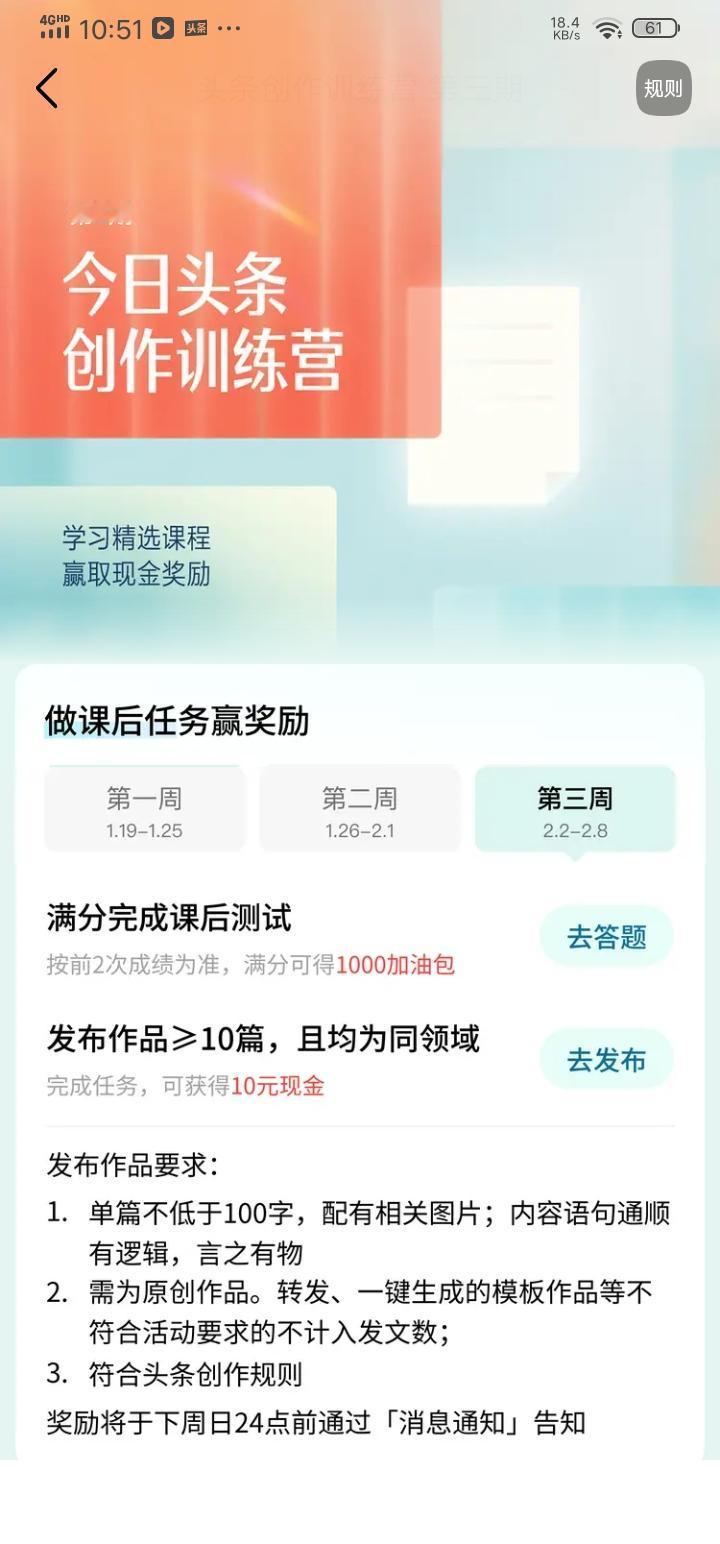 最近头条可太热闹啦,平台邀请我参加头条创作训练营活动,这活动就像一场创作的盛宴,给咱们创作者提供了超棒的机会。 点开活动链接( ),感觉就像打开了一个创作宝藏盒。这里面肯定藏着不少提升创作能力的秘籍,说不定能让我的创作水平蹭蹭往上涨。 对于我这种渴望在头条搞出点名堂的人来说,这活动简直就是及时雨。以前创作的时候,总是会遇到各种各样的问题,比如不知道写什么主题能吸引读者,或者文章的结构怎么安排才合理。参加这个训练营,说不定能从专业老师那里学到实用的技巧和方法。 而且,在这个活动里还能认识好多志同道合的创作者。大家可以一起交流创作心得,分享自己的经验和故事。说不定还能碰撞出不一样的创作火花,一起创作出更优秀的作品。 我已经迫不及待地想要深入这个训练营了。我相信,通过这次活动,我能在创作的道路上迈出更坚实的步伐,写出更多让读者喜欢的内容。不管最后结果如何,这个过程肯定会让我收获满满。我要抓住这个机会,好好提升自己,在头条的创作舞台上绽放属于自己的光芒!
