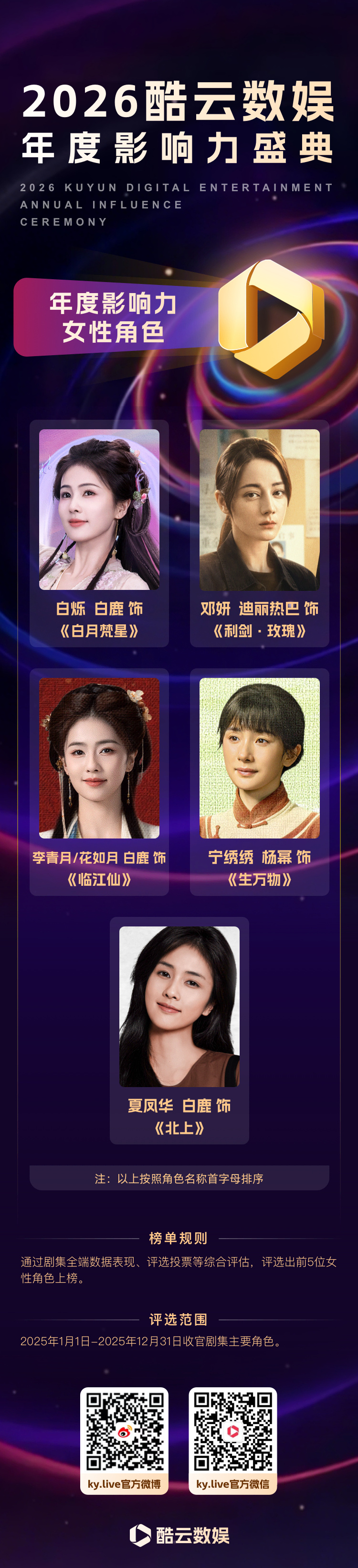 酷云年度影响力女性角色,白鹿去年三部剧三个角色皆上榜。同时期待今天定档2月5号的唐宫奇案,李佩仪也必将成为影响力女性角色!白鹿唐宫奇案定档海报
