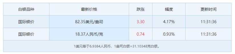 经过这两天疯狂暴跌, 今日现货白银价格有所反弹。 白银价格82.35美元/盎司, 较上一日上涨4.17%。 由于1盎司白银=31.10348克白银, 简单折算成国内白银就是18.37元/克。 不过因为设计、工艺和品牌等 因素有所不同,实际上白银价格高于这个价格。