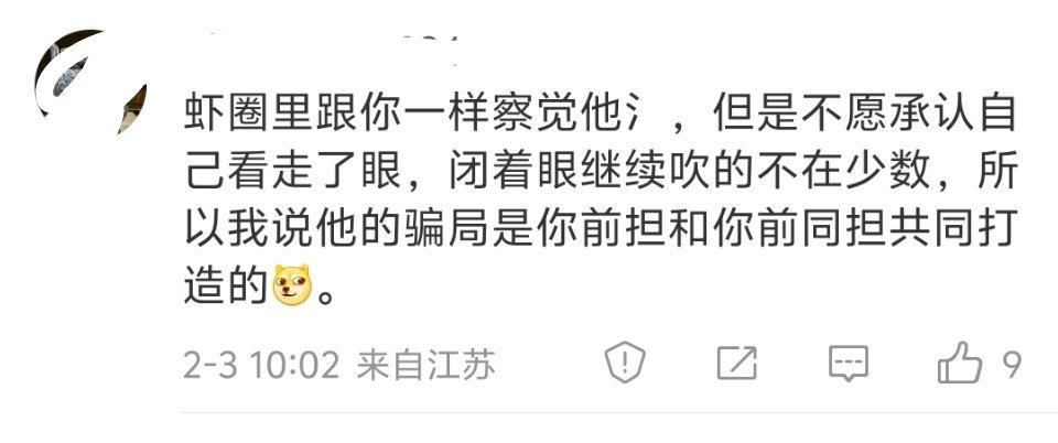 说对一半吧。这是互相筛选的过程。即使意识到,也会藏着捂着,只为了不戳穿这个泡沫。我之所以离开,也是因为残存的理智自救了。但还是要意识到,粉丝经济真正的本质还是在于艺人塑造。如果这是脚踏实地的人,你感受不到吹嘘的价值的,就像张译,平时都悄么声息的,也不爱吹那些虚名。