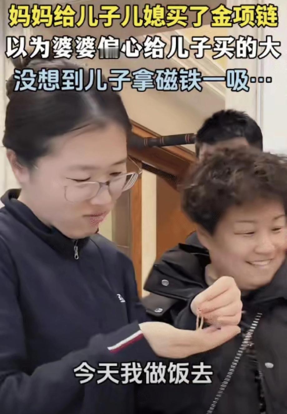 “笑不活了!”上海,女子买了两条金项链。一粗一细。没想到,她把粗的给儿子,细的给儿媳。儿媳拿着细项链觉得婆婆偏心,可儿子拿磁铁一吸,儿媳笑了。 一声清脆的金属撞击声,直接切断了上海这个春节前夕的沉闷空气。此时此刻,客厅的桌上摆着两条截然不同的项链:一条粗得像暴发户的标配,在灯光下闪着咄咄逼人的光芒。另一条细得毫不起眼,安安静静地蜷缩在一旁。 在此之前,那条被磁铁死死咬住的粗链子,差点引发了一场家庭冷战。而那条对磁铁“无动于衷”的细链子,才是这场家庭测试的终极答案。 这不是一场简单的送礼,而是一次关于人性的“压力测试”。事情得倒回到几个小时前。这位上海婆婆搞了一场让人摸不着头脑的分配仪式。按理而言,过年馈赠礼品当秉持公平公正之态,恰似端平一碗水。然而这位老太太却反其道而行之,竟如泼洒碗中之水般,全然不顾应有的平衡。 她将路边随手购得的、体量硕大的廉价链子,郑重其事地置入精美的礼盒内,而后带着满满的仪式感,将礼盒递到儿子手中。 而那条她在金店耗时许久、有着正规证书的纯金细项链,却被她像掏手帕一样,随手从衣兜里掏了出来,塞给了儿媳。 这种反差极其违背常识。在视觉欺诈的逻辑下,儿媳的第一直觉显然被误导了。看着丈夫手里那个大盒子和粗链子,再看看自己手里这条细细的链子,心里的落差感瞬间拉满。 那一刻,儿媳脸上的笑容是僵硬的。她没说话,但眼神里写满了“厚此薄彼”的委屈。毕竟,谁能想到那个被精心包装的“大件”,其实是个铁做的道具? 这时候,破局的人出现了。儿子显然不是个只会收礼的木头人。他目光敏锐,宛如精准的猎手,瞬间捕捉到妻子脸上那稍纵即逝的细微变化,好似在平静湖面察觉一丝不易察觉的涟漪。 他并未急于辩解,毕竟在此刻,视觉冲击带来的震撼已远超言语所能表达。任何言辞在这般强烈的直观感受面前,都显得苍白无力。他选择了物理定律。 他转身移步厨房,又或是翻寻了一番工具箱。须臾,他折返回来,手中已然多了一块散发着光泽的磁铁。 他未作丝毫踌躇,径直将磁铁凑近自己脖颈间那条熠熠生辉的大金链子,那链子仿若散发着万丈光芒,瞬间便被磁铁吸引过去。结果毫无悬念,磁铁像找到了亲人一样,紧紧吸在了链子上。 “妈,你看我加了个坠。”儿子这一句玩笑话,瞬间把客厅里的低气压给捅破了。紧接着,他又拿着磁铁去试妻子手里的那条细项链。无论怎么靠近,磁铁都毫无反应。 彼时,原本兀自生着闷气、眼眶犹带泪意的儿媳,好似阴云中乍现暖阳,刹那间破涕为笑,脸上愁容尽散。物理现象不说谎:吸住的是铁,吸不住的才是真金。 这场“偏心”的真相终于浮出水面。原来婆婆是玩了一手“反向端水艺术”。她表面上给儿子“大的”,实际上给的是“假的”。表面上给儿媳“细的”,实际上给的是“贵的”。 她怕儿子空手尴尬,顺手买个道具安抚。老人担忧儿媳嫌礼物寒酸,可谓煞费苦心。他精心遴选,于琳琅物什中终挑出足金之物,以此表达心意,满心期盼能博儿媳欢喜。 只是这老太太的幽默感太超前,差点玩脱了。好在儿子接住了这个梗。他不仅不嫉妒母亲对媳妇的“真金”偏爱,反而主动充当了那个揭秘的小丑。 那块磁铁吸走的,岂止是铁链,更是这个家庭潜藏已久的矛盾。在那瞬间,似有一股无形之力,将家庭中隐晦的龃龉悄然吸去,留下短暂的平静。 这就很有意思了。如果是直接送,儿媳可能只觉得是一份礼物。但经过这么一遭“误会—失落—验证—反转”,这份礼物的分量在心理上被成倍放大了。 这也给我们提了个醒,家庭生活里,真情往往比真金重要,但有时候,一点点幽默感和豁达的“物理测试”,才是化解隔阂的最好催化剂。 看着一家人笑成一团,你会发现,最高明的爱,有时候就包裹在这种看似“不公平”的恶作剧里。 (来源: 聊城新闻传媒)