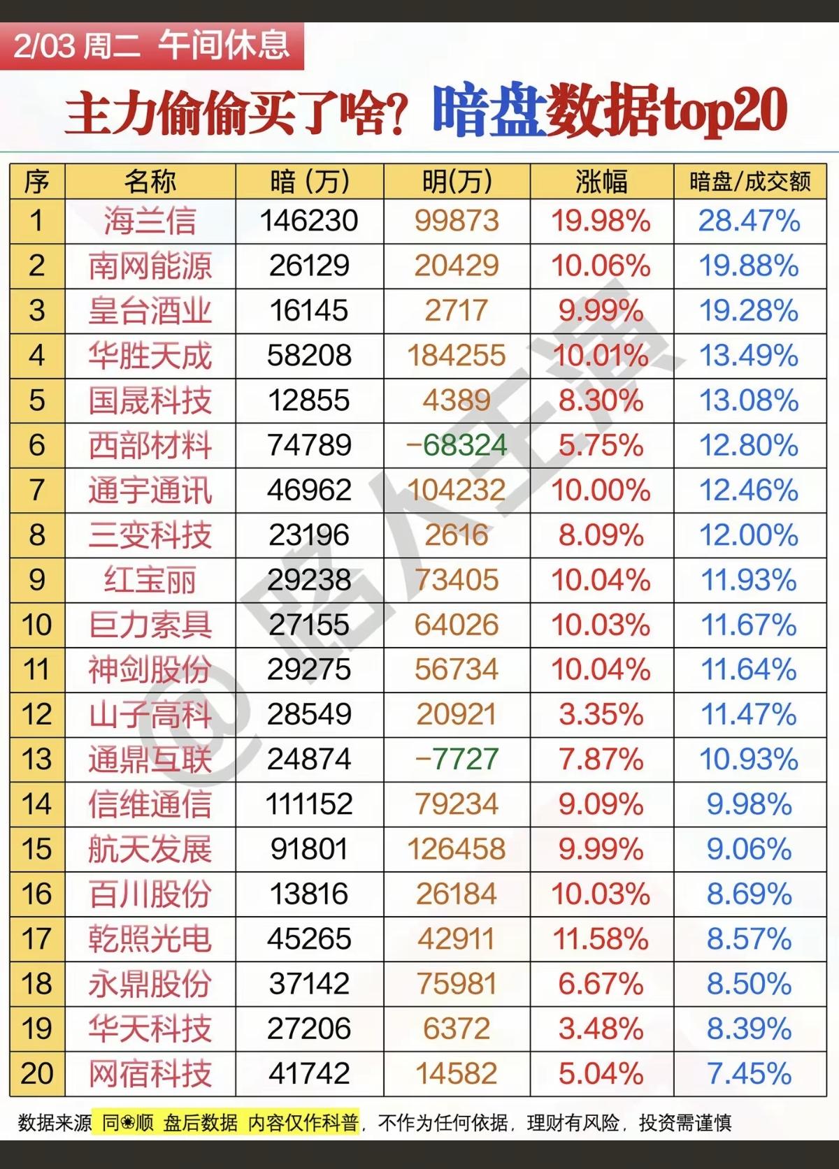 2.3周二 主力抢筹个股榜! 主力暗盘资金 偷偷买了啥股票?! 资金抢筹: 1.光伏储能 2.光通信模块,CPO 3.化工原料,环氧丙烷 4.商业航天 5.稀土永磁 资金出逃:黄金白银,有色金属,石油采掘等资金大幅流出