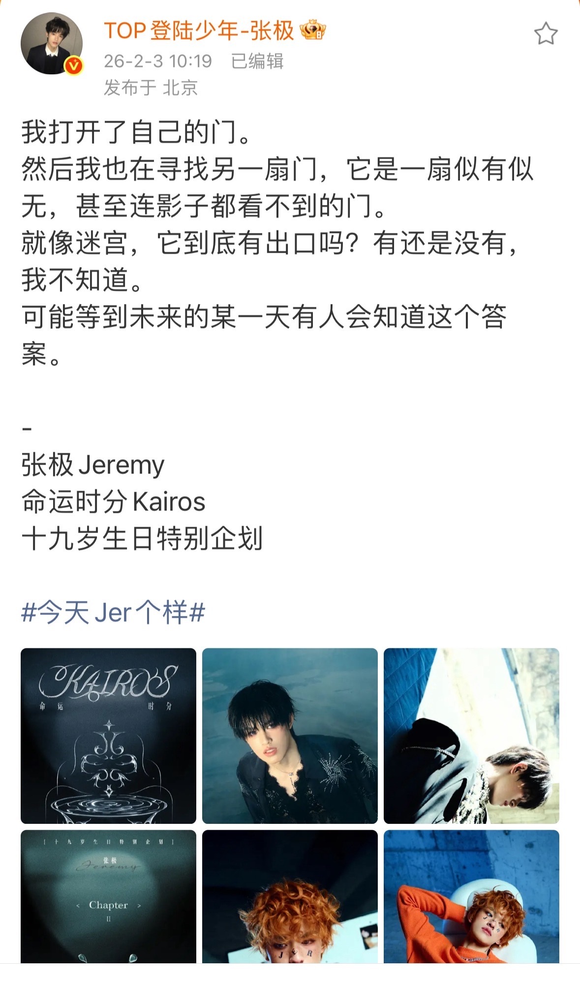 张极19岁生日,晒了腹肌照,染了橘发卷毛,后背上还写了粉丝名字,真是把宠粉刻进了DNA里!18岁的他是迷茫的,面对三扇疑惑之门19岁的他,打开了自己的心门楚门,一场与自我的博弈,期待你能早日寻找到另一扇门❗️