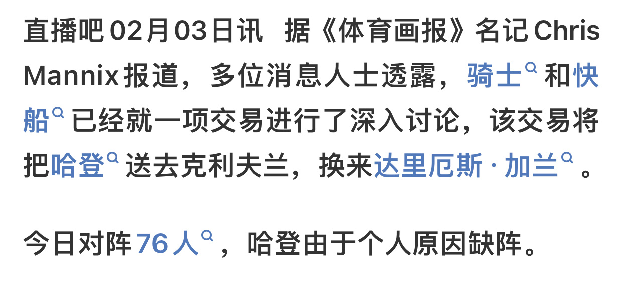下面是一条关于快船巨星哈登的重磅交易传闻!今天据美国名记ChrisMannix