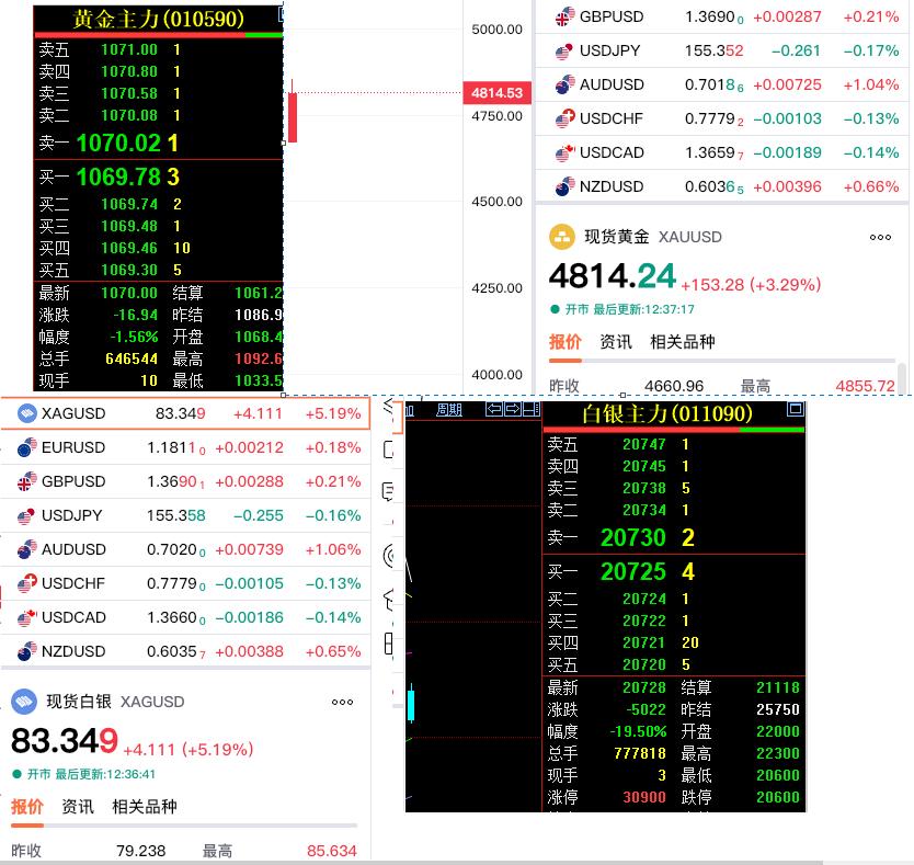 虽然昨日国外贵金属 黄金和白银下跌, 但是今日有所反弹上涨。 不过国内黄金和白银依旧处于跌势中, 黄金白银和国外出现分歧。 通过下图,可以明显看出: 现货黄金报价4814.24美元, 较上一日上涨3.29%; 现货白银报价83.349美元, 较上一日上涨5.19%。 国内黄金期货主力停收于1070元, 较上一日下跌1.56%; 白银期货主力停收于20728元, 较上一日下跌19.5%。