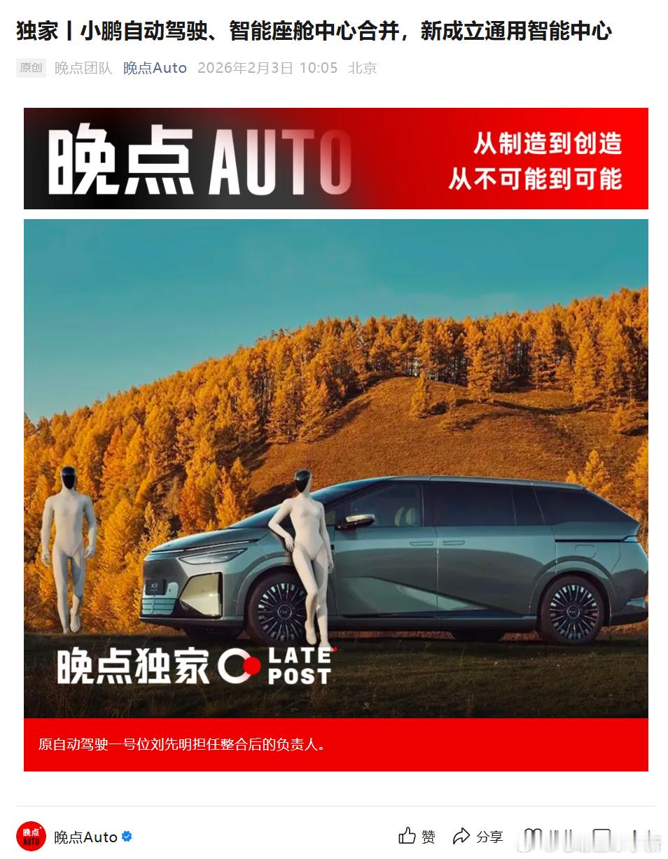 小鹏自动驾驶、智能座舱中心合并,新成立通用智能中心