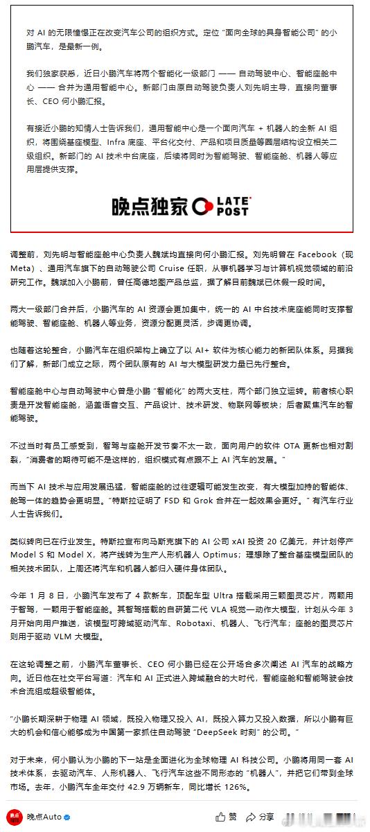 - 调整后:两大部门合并,集中 AI 资源形成统一中台,解决此前开发节奏、OTA 更新割裂问题,确立“ AI +软件”核心团队体系;