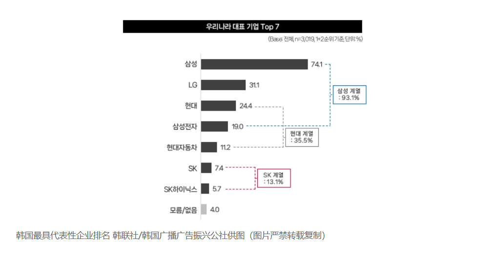韩国广播广告振兴公社(KOBACO)面向全国3019名成年人进行消费趋势调查,并于3日发布调查结果。调查显示,74.1%的受访者认为三星是最能代表韩国的企业,其后依次是LG(31.1%)、现代(24.4%)、三星电子(19%)、现代汽车(11.2%)、SK(7.4%)、SK海力士(5.7%)。