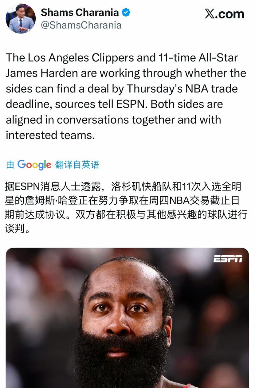 劲爆!Shams:哈登将被交易到骑士。 Chris 说的是骑士、快船已深入探讨哈登换加兰。Shams也说哈登、快船都在争取2月6号前达成。 太突然了,什么原因呢?快船势头正好,谁先提出的? 难怪他缺阵呢,我之前还开玩笑是交易,没想到是真的! 去骑士真起飞:内线能喂双塔,外线有米切尔。莫非登哥真有冠军了?