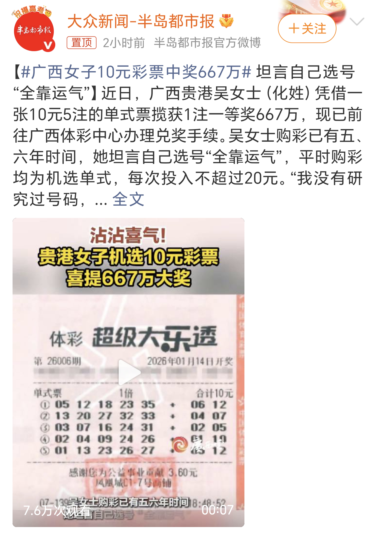 广西女子10元彩票中奖667万快过年了,彩票中奖的消息也是越来越多了,这几天就看到好几个,彩票是又不好卖了嘛