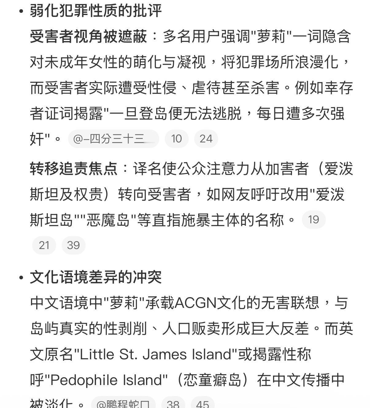 我接受倡议,以后把爱泼斯坦的“萝莉岛”的翻译改称为“恶魔岛”。 因为确实用这个名字会将恶魔的罪恶浪漫化,将弱化对犯罪行为的批评。 任何罪恶都只配有丑陋的名字,用文字上美化事实上是在再一次伤害被害人,是一次不自觉的助纣为虐。 想想以前日本鬼子的“大东亚共荣圈”“王道乐土”,是不是都是用一个美好的名字掩盖了吃人的事实。 点右上角关注我,我们一起去看这个魔幻的世界
