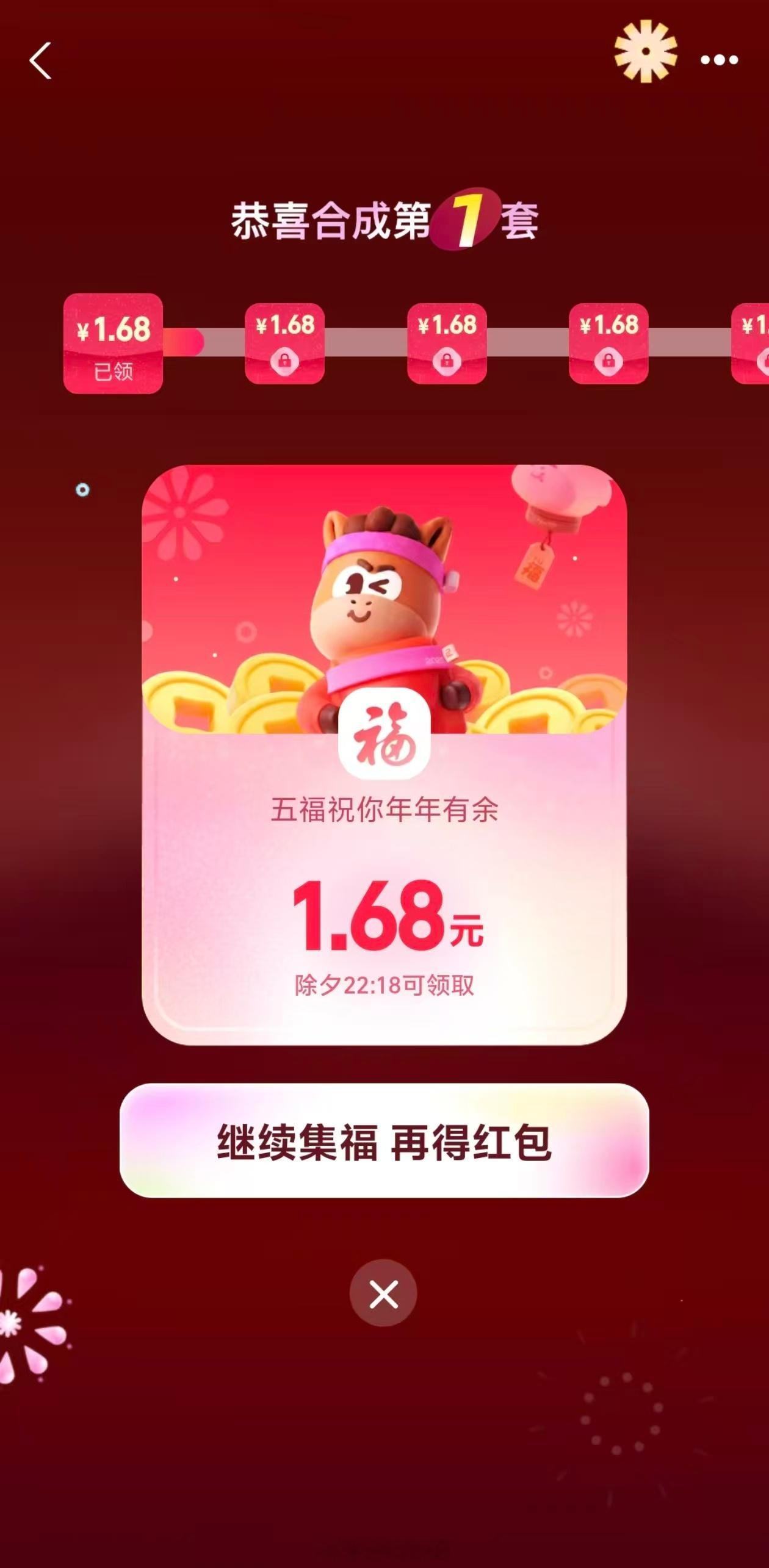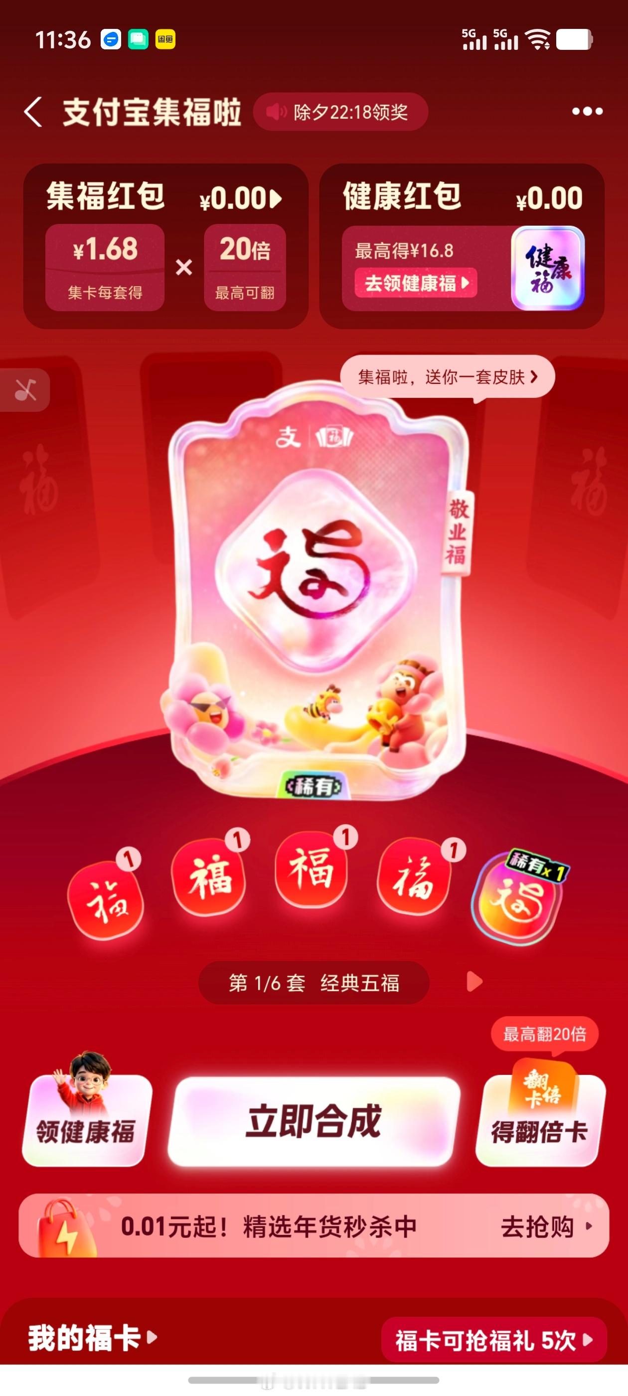 感觉今年的支付宝集五福没啥热度呀,一共能合成 6 套,第一套很好集,预约了早鸟票的话,上线直接领三张,还带敬业福,再做几个简单任务,一分钟都用不了就能集齐,后面几套就比较费时间,没什么心思去弄了。