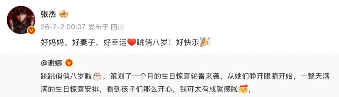 🌙张杰,凌晨发文,12个字,总结了跟谢娜的婚姻现状! 2月2日凌晨00:07,张杰在社交平台发文。距离谢娜发文仅仅过了11分钟。通过坐标可以看出,谢娜在上海,张杰在四川,两人不在一起。那么到底是什么事让两人几乎同时发声呢? 2月1日深夜23:56,谢娜率先发文,字里行间满是作为妈妈的温柔与成就感,她细致描述了自己提前一个月策划生日惊喜,还用自创的“哟赫”游戏引导女儿学会乐观,被孩子们夸赞有“乐观超能力”。 仅仅过了11分钟,张杰准时转发了谢娜的这条动态,配上12个字的文案:“好妈妈、好妻子,好幸运跳俏八岁!” 看似简单的一句话,既肯定了谢娜作为妈妈的用心,也直白夸赞她的妻子身份。 两人异地同步发声的背后,是各自忙碌的事业与默契的牵挂。彼时谢娜在上海筹备工作,兼顾着为女儿庆祝生日的事宜,而张杰则在四川忙于个人巡演相关的筹备,虽相隔千里,却没错过这个重要的家庭时刻。 其实这不是夫妻俩第一次异地同步送祝福,此前女儿生日、结婚纪念日,哪怕身处不同城市,两人也总会用各自的方式互动,要么互相转发动态,要么隐晦提及对方,这份无需言说的默契,早已成了他们婚姻里的常态。 张杰的12个字,看似简单,却藏着对谢娜多年付出的认可,他们从2011年公布恋情,2015年结婚,如今相伴十多年,从最初的不被看好,到如今儿女双全,一路携手走过不少风雨。 过往张杰就多次在公开场合夸赞谢娜,说她孝顺长辈、用心照料三个女儿,还会精心钻研辅食,直言谢娜是自己的人生后盾,甚至曾喊话“到死都爱她”,而这次深夜的12字夸赞,更像是私下里的温情延续。 这场深夜联动,也悄悄打破了此前网上流传的“婚变”传闻。前段时间,因为两人同框次数减少,再加上各自专注于事业,偶尔出现不同步的行程,就有网友恶意猜测他们婚姻出现裂痕,甚至编造出“分居”“感情变淡”的虚假言论。而这次两人跨越千里,在深夜同步为女儿庆生,无疑是对谣言最有力的回应。 更让人动容的是,张杰的巡演现场,总会特意留出给家人的专属环节,此前就曾在演唱会上联动现场万人,尽显父爱与对家庭的重视;而谢娜不管工作多忙碌,也总会抽出时间陪伴孩子,还会在社交平台分享育儿日常,他们没有刻意炒作恩爱,却总能在细节里,暴露对彼此、对家庭的牵挂。 网友的反应也格外真实,有人留言“这才是婚姻最好的样子,不用刻意秀恩爱,细节里全是温柔”,也有人感慨“父母相爱,才是孩子最好的成长土壤”,还有人被两人的默契打动,直言“12个字,胜过千言万语”。 其实,张杰和谢娜的婚姻,一直都有着自己的节奏。他们没有过度消耗感情,也没有刻意迎合外界的期待,而是在忙碌的事业中,守住对彼此的初心,兼顾家庭与热爱。 张杰的12字发文,不是刻意总结婚姻现状,更像是一份自然而然的温情流露,是对谢娜多年付出的看见,也是对家庭的珍视,那些藏在细节里的默契与牵挂,远比华丽的辞藻更有力量。 如今,跳跳和俏俏已经八岁,张杰和谢娜也相伴走过十多年,从青涩爱恋到儿女双全,他们经历过争议与谣言,也收获过无数祝福与认可。 这场深夜的11分钟联动,12字的温情夸赞,不仅是为女儿庆生,更是两人婚姻状态的真实写照。有人说,好的婚姻就是彼此认可、互相包容,也有人觉得,长久的感情需要频繁的互动与陪伴。 那么你觉得张杰的12字发文,道尽了婚姻的真谛吗?这样低调又默契的婚姻模式,是不是你心中最理想的样子?欢迎留下你的观点。