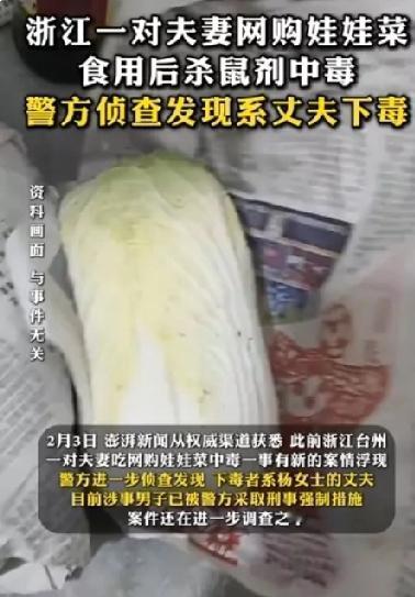太冤枉了,因为这件事商家把店铺都关了!夫妻网购娃娃菜中毒,警方发现竟然是丈夫下毒! 2025年12月,浙江台州天台县一对夫妻的一场普通网购,竟酿成惊魂中毒事件,更在一个多月后曝出惊天反转。妻子杨女士花费17.48元,在电商平台网购8斤娃娃菜,12月16日到货当天,夫妇俩清水煮食,结果次日便双双突发身体不适。 杨女士率先流鼻血不止,随后夫妻二人相继出现牙龈出血、皮下瘀斑症状,病情急转直下,被紧急送往天台县人民医院。12月23日,医院出具诊断书,明确二人系杀鼠剂(溴鼠灵)中毒,伴随重度贫血、凝血功能障碍,随时有颅内出血风险,当即转入ICU抢救。杨女士在ICU救治逾一个月才脱离危险,丈夫更是出现肺积水、呼吸衰竭,住院观察许久。 事发后,夫妻二人坚称家中没有鼠药,日常均菜场买菜,唯一外来食品便是这箱网购娃娃菜,杨女士随即联系商家维权,却遭客服否认,涉事店铺“森逸轩花卉园艺”随后下架失联,1月25日账号已注销。警方初期侦查,曾锁定毒源为包裹娃娃菜的旧报纸,推测商家为省成本,用沾染杀鼠剂的废旧报纸包装,导致毒物渗透蔬菜,彼时全网皆为夫妻二人惋惜,谴责商家无良。 谁料2月3日案件迎来惊天反转,警方深入侦查后查明,真正下毒者并非商家,而是杨女士的丈夫!警方通过现场勘查及缜密排查,证实其丈夫蓄意投毒,导致夫妻二人中毒。目前涉事男子已被警方采取刑事强制措施,具体作案动机及投毒细节,案件仍在进一步调查中。 网购娃娃菜中毒案的惊天反转,远比剧情更戳心,枕边人变成投毒者,到底是因为什么? 夫妻本是风雨同舟的至亲,理应相濡以沫,可本案中的丈夫却暗藏杀机,借网购蔬菜掩盖恶行,让朝夕相伴的爱人身陷ICU,这般恶意,凉薄到刺骨。刚开始众人都谴责商家包装违规、漠视食品安全,为此商家也能受了不白之冤,还关掉了店铺。可真相浮出水面,才知最可怕的风险从不是外来隐患,而是身边人的居心叵测。 婚姻中不管有什么矛盾,有天大的问题,都不该用如此极端的方式去解决。能过就过,不能过就散,没有什么比生命更重要的,希望这起案件能给大家敲响警钟,在婚姻中多一份坦诚与理解。也希望大家从这起事件中明白,人与人之间相处,真诚才是长久之道。无论是爱情还是友情,都需要我们用心去经营,用真心去对待。