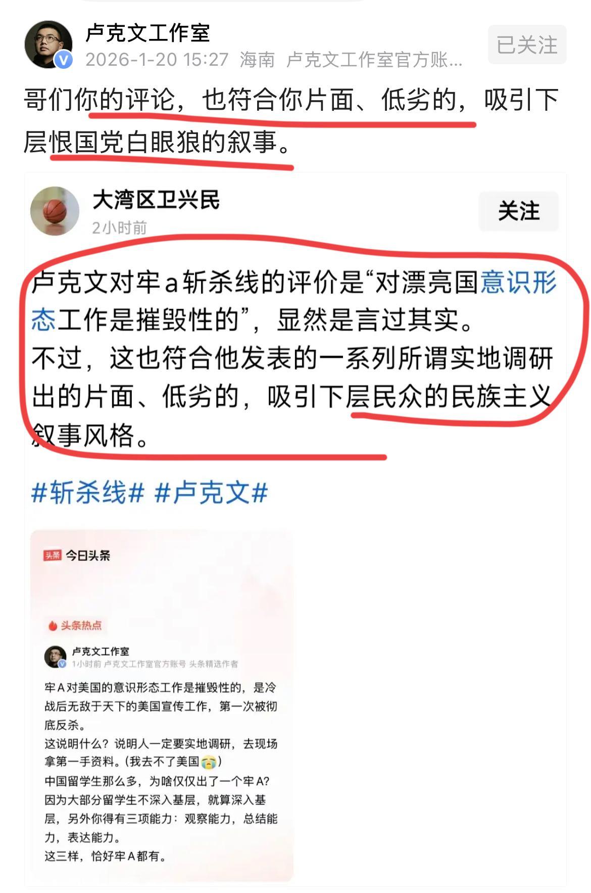著名大V,国际问题专家卢克文这次真的生气了!!卢总常年坚持自费全球研究,实地考察调研,为的是收集一手鲜活的资料,做到客观,科学的分析,带给各位看客最丰盛的精神大餐!但是,也有网友不认同卢总的实地研究~特别是他对牢A的那句评价,他说是对老美意识形态的一种摧毁~不过也很符合他的一贯一系列的所谓实地研究得出来的片面,低劣的,以此吸引下层民众民族主义的叙事风格!!这句话把卢总彻底激怒了,他非常罕见地反击到,哥们你这样的评论,确实也非常符合你片面,低劣的,吸引下层恨国党,白眼狼的叙事风格! 呵呵,卢总有点急眼了吗? 你觉得谁说的有道理呢,你有何看法?