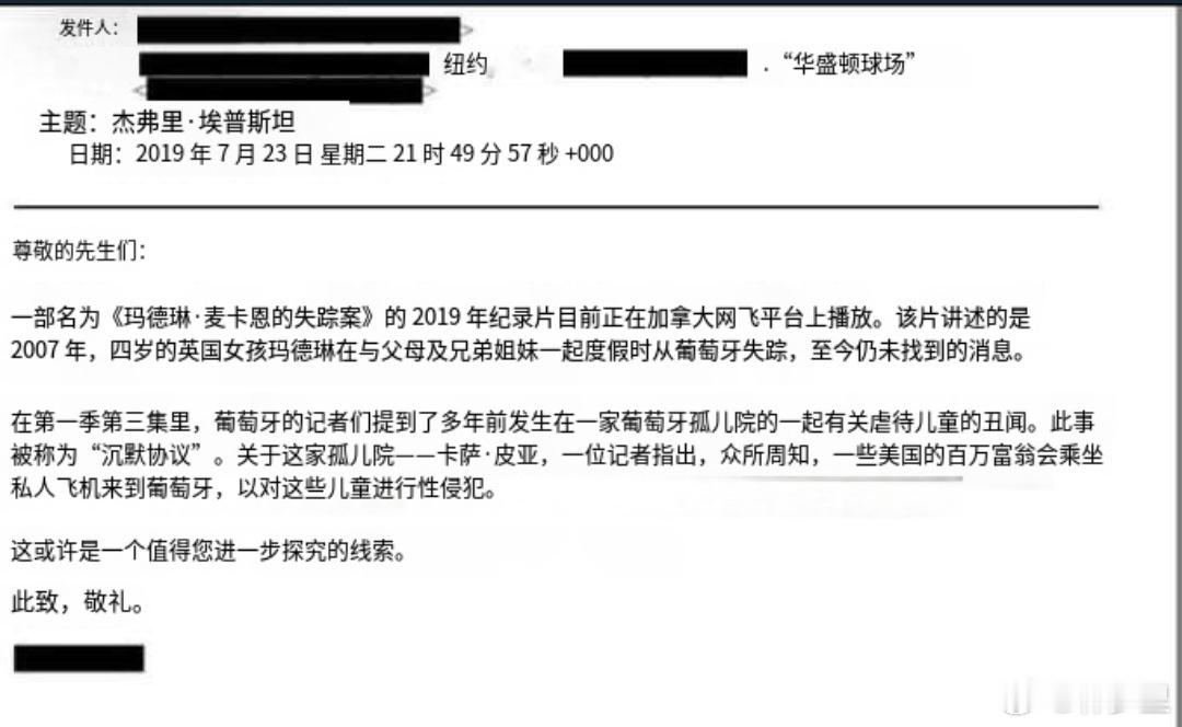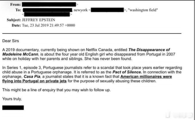 而这次爱泼斯坦档案的邮件提到的信息,说当年美国的富翁坐私人飞机去葡萄牙弄小孩虐待侵犯,玛德琳·麦卡恩失踪可能就是爱泼斯坦团伙干的,图4。
