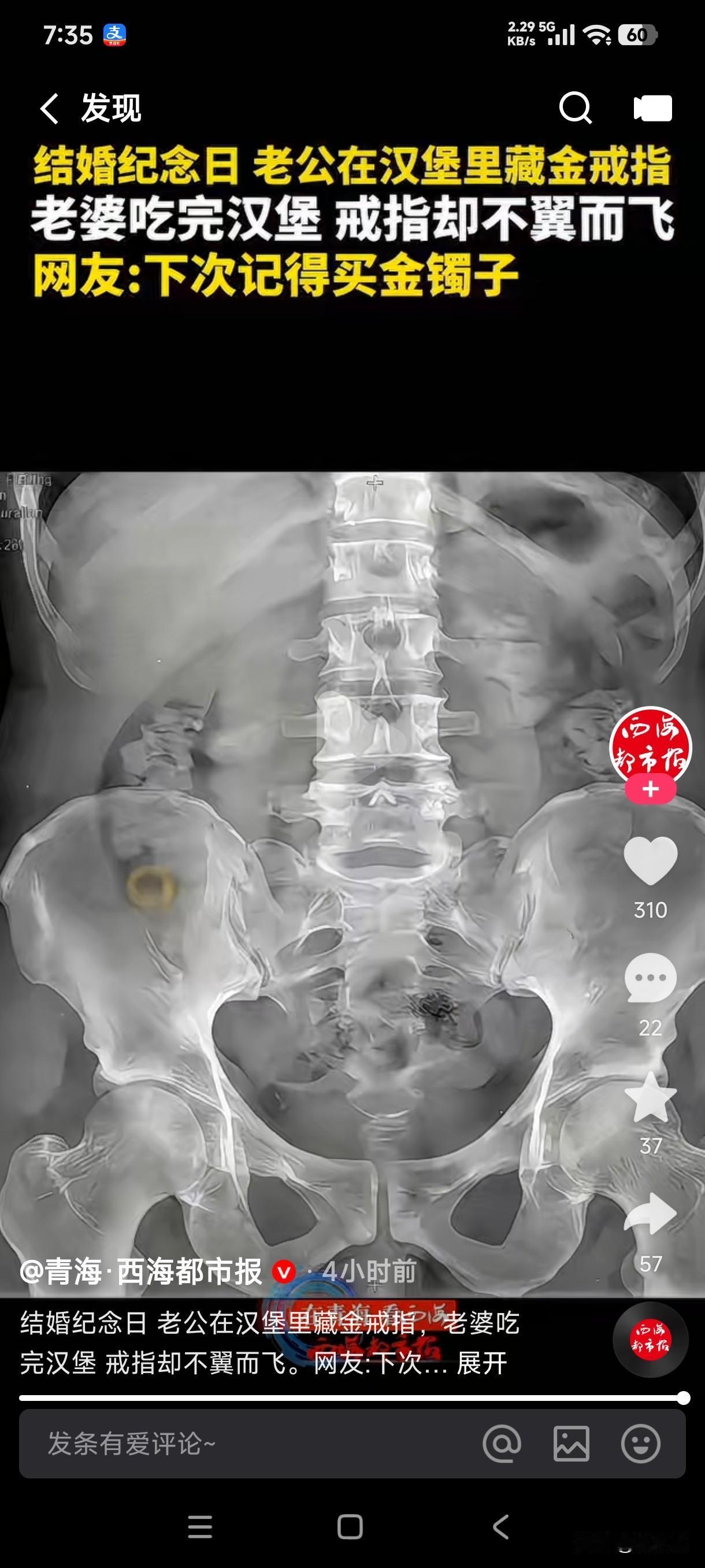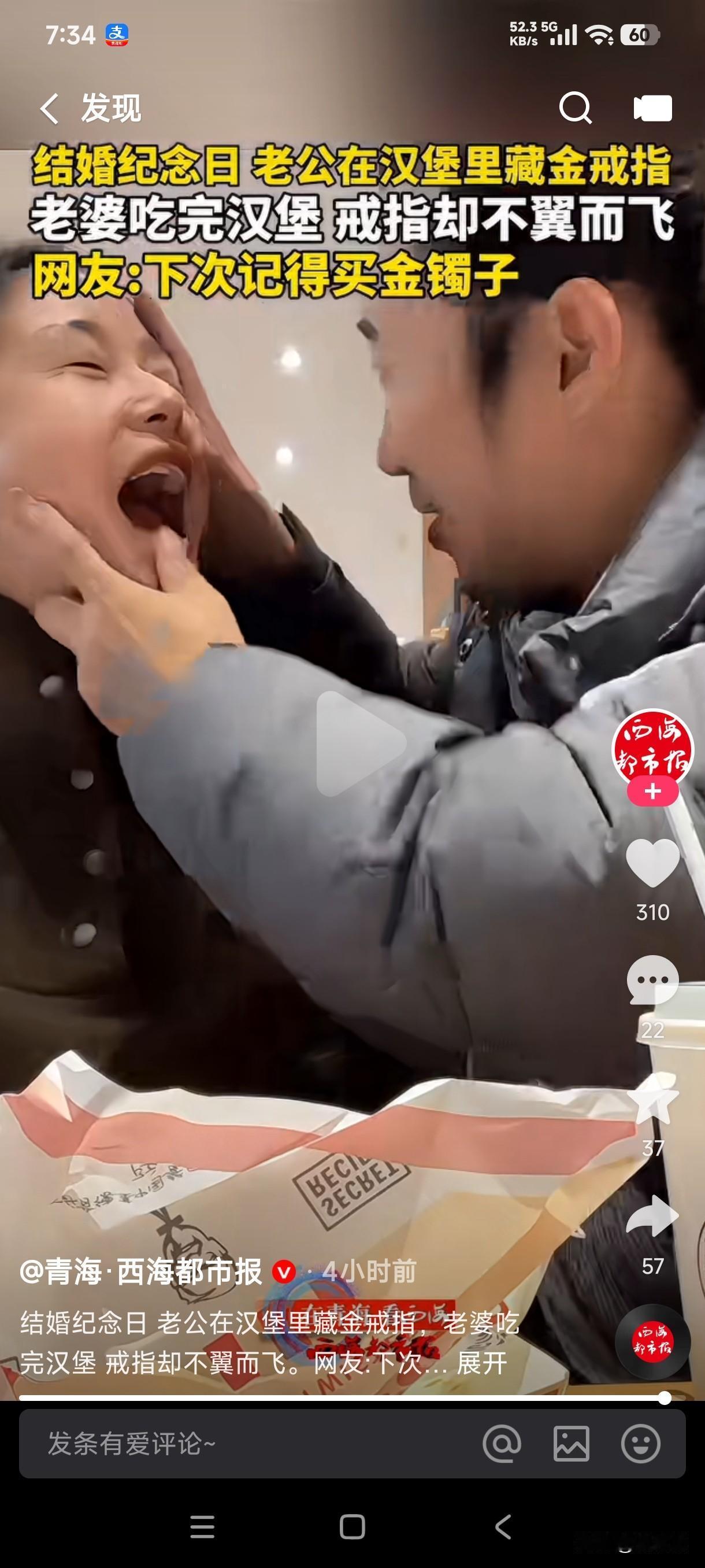 结婚纪念日老公在汉堡里面藏金戒指,老婆吃完汉堡戒指却不翼而飞了,最后上医院检查后发现戒指在老婆的胃里。 这女子吃东西从来不嚼吗?那么大一个汉堡她全程吃完居然没有发现金戒指的存在,这是她专心吃了汉堡了,还是她忘了结婚纪念日了,老公坐在旁边还等着她发现惊喜呢?直到她吃的一干二净都没有发现戒指的影子,老公还掰开她的嘴巴在嘴里找,最后居然进了她的肚子,这制造惊喜突然变成制造惊吓,最后还得去医院检查,这结婚纪念日是不是过的太有意义了? 这男子下次结婚纪念日肯定得买金镯子,还是按照上次的操作藏在汉堡里面的老婆在指定吃不到肚子里去了,这吃进肚子里的金戒指是做手术取出来?还是等她上厕所给拉出来?这以后戴在手上是不是都会有屎的阴影存在?