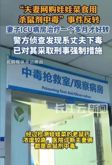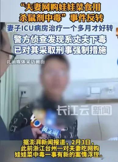 “反转来了!”浙江台州,妻子网购娃娃菜,夫妻俩双双杀鼠剂中毒,妻子根据民警的调查,认为是报纸上有杀鼠剂,粘在娃娃菜上,他们吃了娃娃菜,才中毒的,如今反转来了,原来不是娃娃菜上有杀鼠剂,而是丈夫下的毒。 杨女士或许怎么也没想到,她和丈夫杀鼠剂中毒,花了那么多钱治疗,她想向商家讨个说法,民警调查的结果居然是,这杀鼠剂是她丈夫下的毒,并非是网购的娃娃菜原来有杀鼠剂。 她一心想得到的结果,想得到的赔偿,最后却得到这个结果,她又痛心又难过,她难以接受。 原来,随时有可能剥夺她生命的,并不是人家的娃娃菜,而是自己的枕边人,这实在让她感到恐惧,害怕,痛苦。 这事情发生在2025年12月14日,当时杨女士想买菜,正好看到有一家店卖娃娃菜,价钱便宜,在看起来又非常新鲜。 这个娃娃菜保存的时间比较长,即使从网上买,路途中运输两三天,到货也不会影响娃娃菜的品质,更不会影响口感。 杨女士和丈夫都爱吃娃娃菜,有这么实惠,看起来又嫩又新鲜的娃娃菜,她决定买一箱。 那一箱娃娃菜,她只是花了17.48元,下单之后,到货也非常快,16日就到了。 新鲜蔬菜买回到家,杨女士马上拿了一两颗娃娃菜让丈夫洗,他们要吃娃娃菜。 当天晚上,他们就吃到了鲜甜可口的娃娃菜,这一顿美味的晚餐,却让他们住进了医院。 他们吃完菜之后,就明显感到有些不舒服了,第二天他们就开始流鼻血,后来他们口腔出血。 他们不知道是怎么回事,就赶紧去医院,在住院的第2天,杨女士就晕倒了,医院经过检查,告诉他们,这是重度杀鼠剂中毒。 一听到自己中毒的消息,杨女士就不明白了,她和丈夫怎么会无缘无故中毒。 他们回想了一遍,也找不到中毒的原因,后来他们只好报了警,并且将自己吃过的东西告诉民警。特别是那一箱娃娃菜,杨女士特别提醒,就是吃了那些娃娃菜之后,他们夫妻俩出现了这些症状。 就这样,这箱娃娃菜成了重点调查的对象,经过民警的调查,他们确认这娃娃菜有杀鼠剂。 当然这杀鼠剂并不是本身就撒在娃娃菜上,是包娃娃菜的报纸上有杀鼠剂,才粘到娃娃菜上,才导致夫妻俩吃了娃娃菜中毒的。 得到这个消息,杨女士就气愤了,这商家怎么可以卖有老鼠药的娃娃菜给别人,她当时一个电话就打过去,要求商家给个说法。 可商家一口咬定他的娃娃菜,没有老鼠药,如果要坚持说他的娃娃菜有老鼠药,他要求经公,由民警出一份证明,证明老鼠药是原本就出现在娃娃菜里面。 但是杨女士并没有得到民警给出的证明,她只能找来记者,她把这件事情的经过告诉记者,让他们帮忙报道出去。 在这件事的过程中,杨女士的丈夫说,当时这箱娃娃菜是他拿回家的,当时煮娃娃菜的时候,他还洗了两遍娃娃菜,这才煮的,不料两人还是中毒了。 这一次中毒害惨了杨女士,她在重症病房住了一个多月,情况才有所好转,她的丈夫情况倒是好些,没住多久就出院了。 因为这一次中毒事件,杨女士花了3万多元,丈夫也花了2万左右,花了这么多钱,他们当然想让店家进行赔偿。 店家下架了所有的产品,就是没有马上赔偿,依然要求民警调查清楚,给出证明,他们才会承认。 既然店家不愿赔偿,不愿承认此事,杨女士便让记者把这件事报道出去,她要讨个说法。 如今过去了那么一段时间,事情却有了大反转,民警也终于查清楚杀鼠剂的来源了。 原来这杀鼠剂并不是原本就出现在娃娃菜中,而是杨女士丈夫下的毒,至于她丈夫为何要下毒,这件事,民警还在进一步调查中。 这个反转有点出乎大家的意料,杨女士中毒之后,一直想着,可能是娃娃菜不小心有杀鼠剂,才导致她和丈夫中毒,她真的从来没有想过,居然是丈夫下的毒。 这件事的真相让她感到很恐惧,丈夫是她的枕边人,她最信任的人,丈夫居然会给她下毒,实在是太令她害怕了。 发生这样的事情,就算是杨女士已经康复,这个真相都给她带来了非常大的影响。 她以后或许再也不敢信任丈夫了,毕竟枕边人要做伤害她的事情,是防不胜防的。 不管丈夫出于什么原因下毒,他的主观意识应该都是想要剥夺妻子的生命。如果是这样子,那么丈夫的行为已经构成了故意杀人罪。 《刑法》第232条规定:故意杀人的,处死刑、无期徒刑或者10年以上有期徒刑;情节较轻的,处3年以上10年以下有期徒刑。 有这样的丈夫在身边,他隐藏自己的歹毒,暗里给妻子下毒,这真的是一件非常恐怖的事情。 那么你对杨女士的遭遇有何看法呢?
