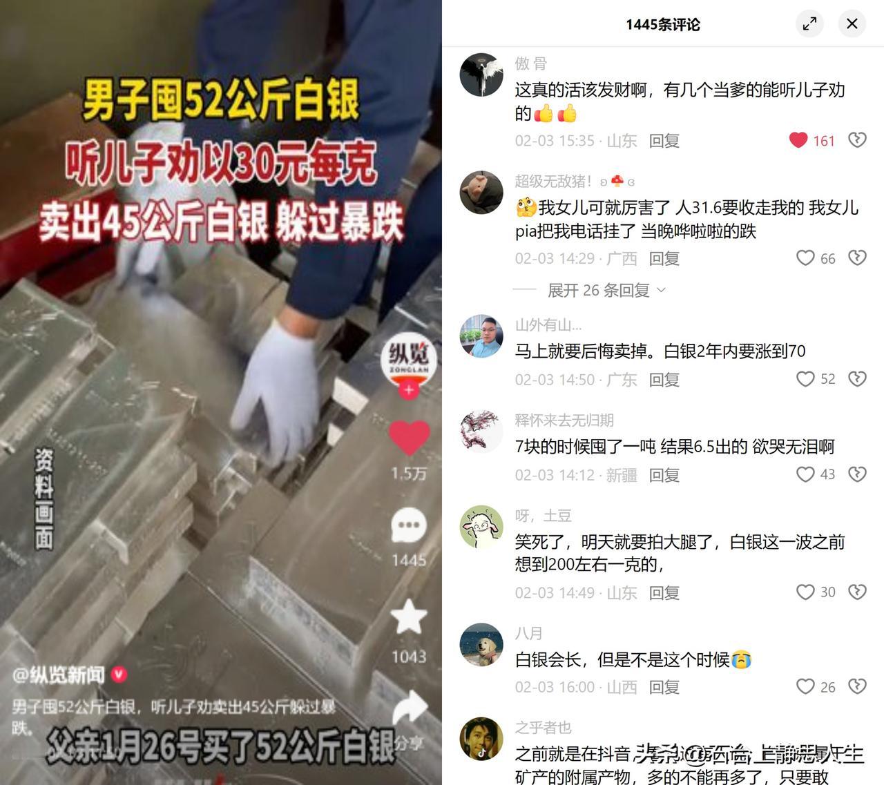 老爸听儿子劝,卖白银躲过暴跌 囤了52公斤白银的老爸,在30元/克的历史高点,听儿子劝卖掉45公斤,刚好躲开第二天超14%的暴跌,稳稳锁定了收益。 这事儿旁人看着是神操作,倒也暴露了普通人理财的两个死穴:一是长辈的经验执念,总觉得自己吃过的盐比晚辈吃过的饭多,面对新行情反而听不进理性分析;二是贪念上头,明明已经到了历史高位,还盯着涨到70元的大饼,舍不得收手。 再看大家伙儿的经历,有人被晚辈劝卖直接挂电话,转天就亏得心疼;有人低位囤货却拿不住早早卖出,后悔到捶胸。这不都是被执念和情绪牵着走? 哪有那么多精准逃顶,说到底就是能放下我才对的架子,听得进身边人的劝,关键时刻不被贪念冲昏头脑而已。 你理财时,有过听劝躲过坑,或者固执吃了亏的经历吗?