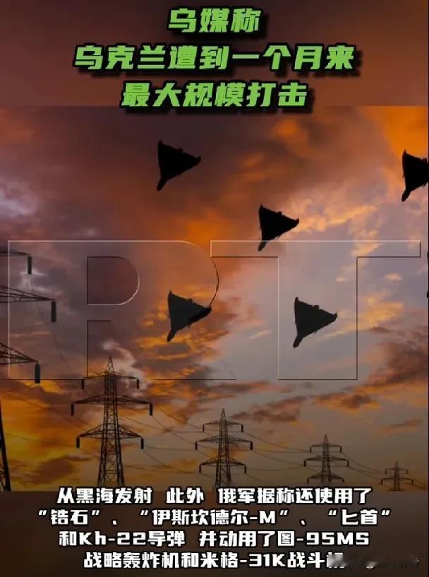 乌克兰能源设施遭遇一个月来最大规模的混合打击。 1月29日,特朗普称,普京已同意暂停对乌克兰部分能源基础设施的打击,为期一周。当天,有俄罗斯军事博主称,俄军方高层已于1月28日下达命令,从1月29日早7时至2月3日暂停所有远程打击行动,暂停范围包括基辅市和基辅州的所有目标,以及乌克兰全境的所有能源基础设施。 袭击暂停一周后,乌克兰再次迎来针对能源设施的打击。据《今日俄罗斯》援引乌克兰当地社媒信息,乌克兰能源设施2月2日至3日夜间遭遇一个月来最大规模的混合打击。消息指出,俄罗斯在此次打击中发射了350至500架无人机和多达65枚导弹。   初步信息显示,新一轮打击的目标包括:哈尔科夫的第6热电厂、第聂伯罗彼得罗夫斯克的第聂伯罗彼得罗夫斯克热电站、基辅州特里波利耶热电厂、基辅达尔尼茨卡娅热电厂,以及哈尔科夫和敖德萨的变电站,文尼察的拉迪任热电站。   乌克兰社交媒体称爆炸发生在:基辅、第聂伯罗彼得罗夫斯克、哈尔科夫、文尼察、敖德萨和切尔尼戈夫。   乌克兰社交媒体写道:有“口径”巡航导弹从黑海发射。此外,俄军据称还使用了“锆石”、“伊斯坎德尔-M”、“匕首”和Kh-22导弹,并动用了图-95MS战略轰炸机和米格-31K战斗机。   出现断电的地区有:丘古耶夫、哈尔科夫州部分地区以及苏梅州。哈尔科夫市长捷列霍夫称,该市正在从829栋住宅的管道中排水,以防止管道冻裂。