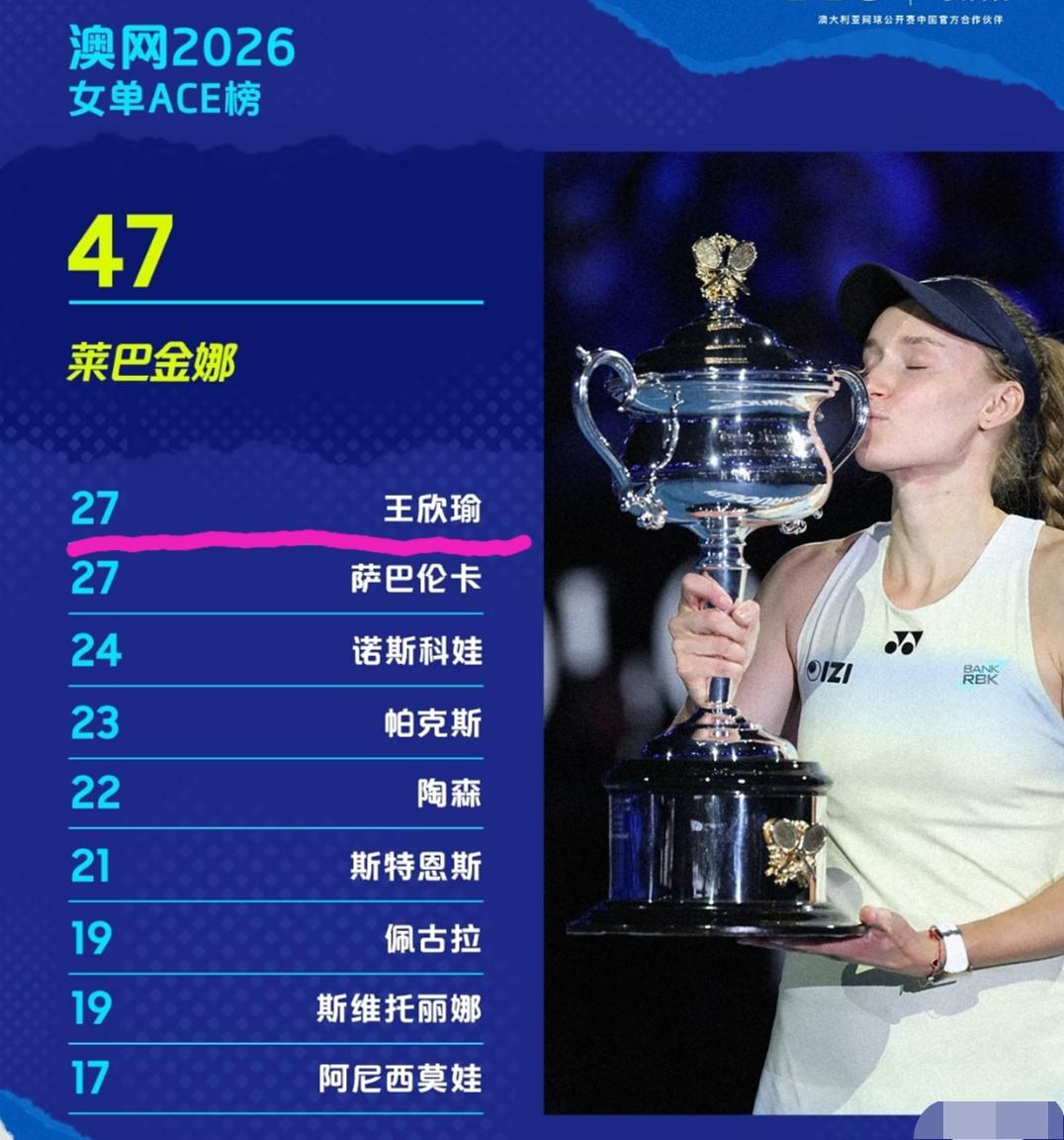 澳网女单球员ACE球top10榜单。 新科澳网女单冠军莱巴金娜以47个ace断档领先,平均一场发出近7个ace球。中国金花王欣瑜和萨巴伦卡以27个ace球并列第二,这其中萨巴伦卡也是打了7场比赛,而王欣瑜仅仅打了4场比赛,平均一场也是发出7个ace球,这个平均值实际上比排在第一的莱巴金娜还是高一点。说王欣瑜是本届澳网的“ace球女王”也是一点不为过的。 而王欣瑜能最终杀入16强,强大的发球能力在这其中也是为王欣瑜助力不少!