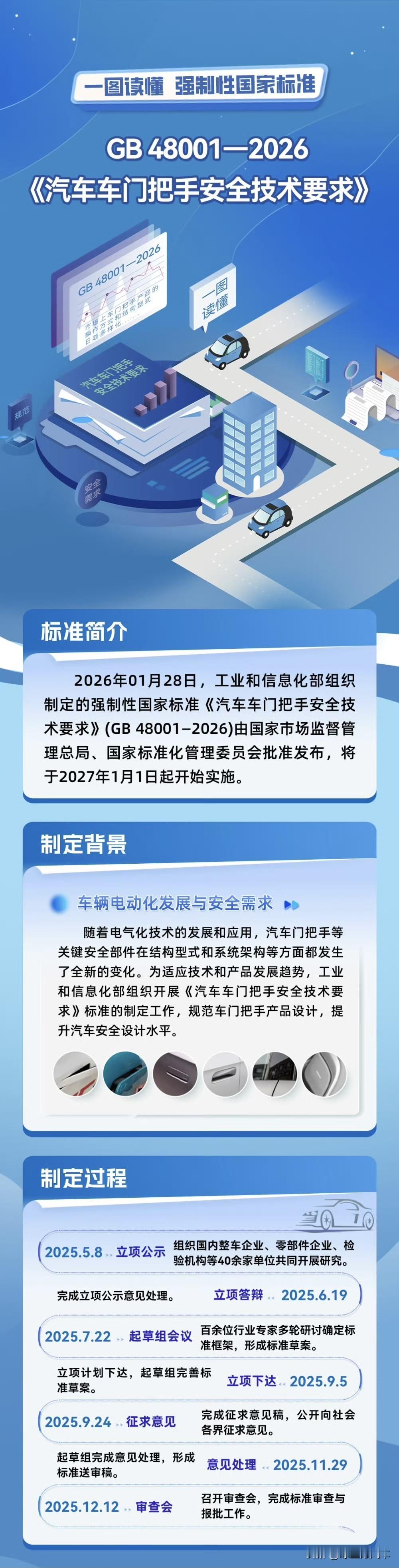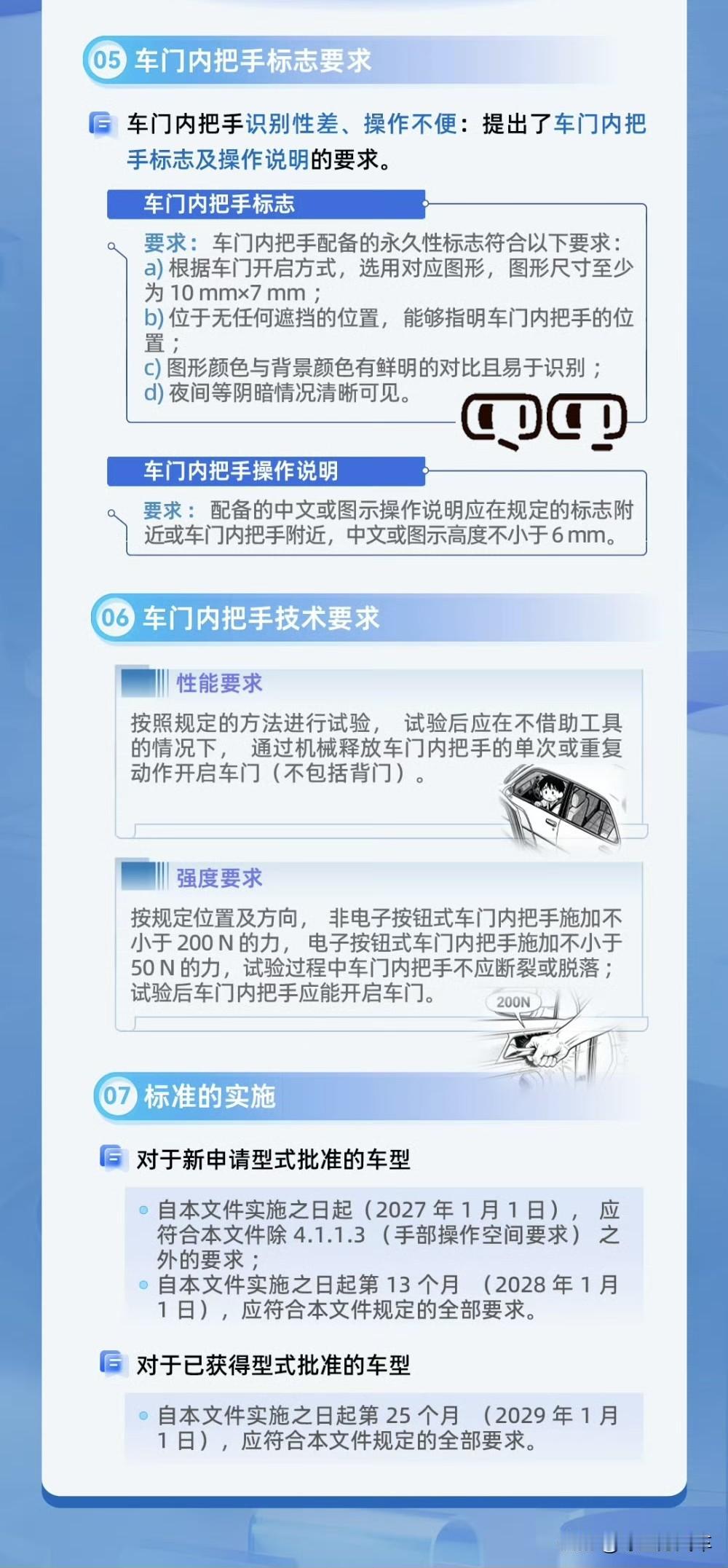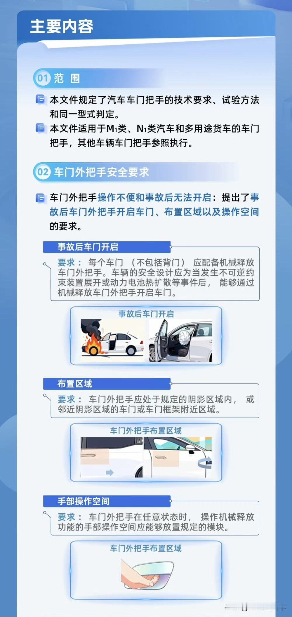 一图看懂:2027年1月1日起实施,车门把手强制性国家标准正式发布!汽车门把手强制性国标发布 近日,我们从官方获悉,工信部组织制定的强制性国家标准《汽车车门把手安全技术要求》正式批准发布,并将于2027年1月1日起开始实施。这份文件规定了汽车车门把手的技术要求、试验方法和同一型式判定。 文件的主要内容包括:车门外把手应配备机械释放把手,并且拥有足够的手部操作空间;对于能够在车外电释放门锁的车辆,可通过机械车门外把手单次或重复动作开启车门;每个车门应配备至少一个车门内把手,并且无遮挡,对应乘员位置直观可见;车门内把手配备标志和操作说明。 同时,强制性国家标准还对车门外把手的性能、强度都提出要求。对于车门内把手操作便利性差、部分场景下功能丧失:提出了机械释放配置、布置区域的要求。车门内把手识别性差、操作不便:提出了车门内把手标志及操作说明的要求。大家一起来学习下!