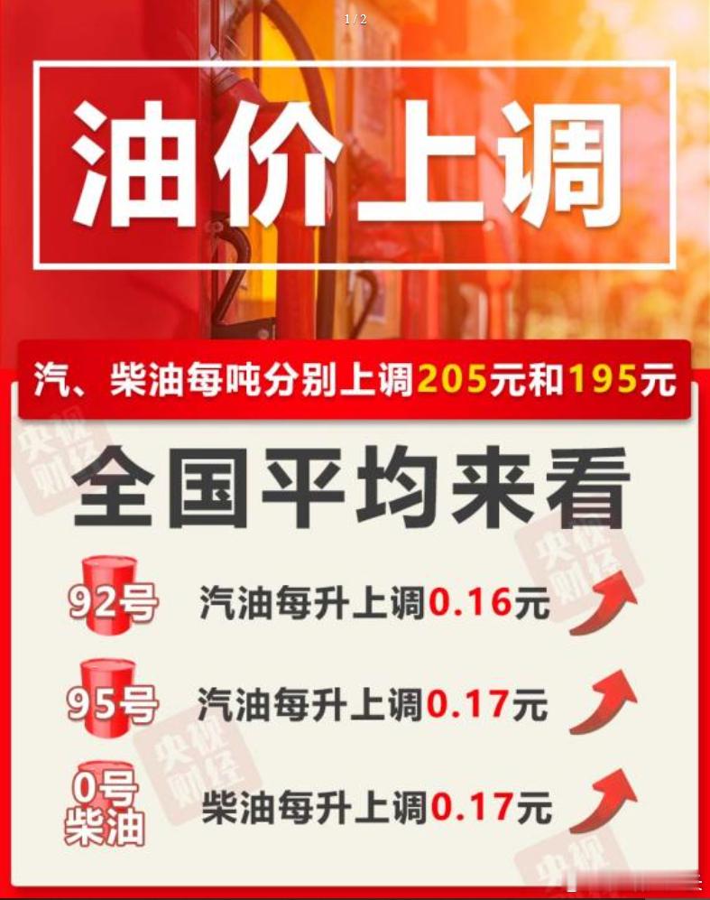2月3日24时起,国内汽、柴油零售限价每吨分别上调205元、195元。全国平均来看:92号汽油、95号汽油、0号柴油每升分别上调0.16元、0.17元、0.17元。央视财经记者给您算了笔账,用92号汽油加满50升油箱将多花8元。